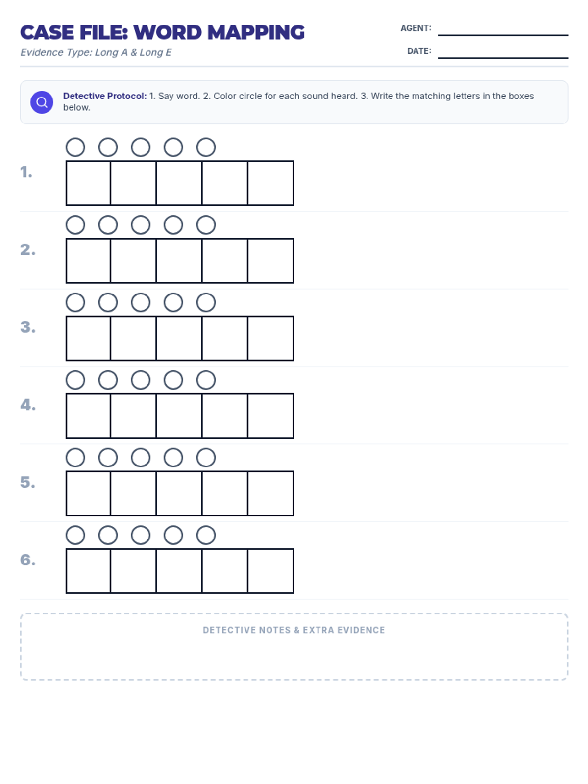 A student worksheet for phoneme-grapheme mapping and word dictation, featuring sound circles and letter boxes for practicing Long A and Long E spelling patterns.