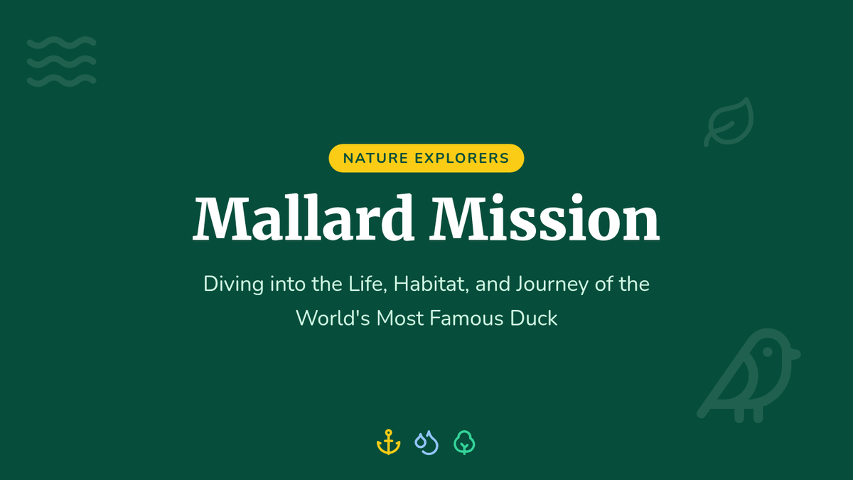 A visually engaging slide presentation about Mallard ducks, featuring their habitat, diet (dabbling), and life cycle from egg to adult with clear sections and review questions. Updated to ensure accurate visual representation of male and female ducks.