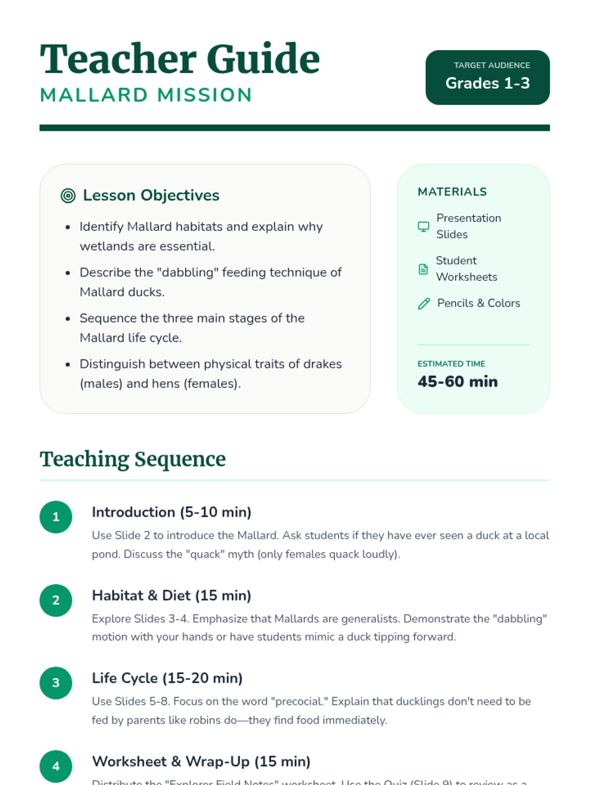 A comprehensive guide for teachers to deliver the Mallard Mission lesson, including objectives, pacing, discussion prompts, and an answer key for the student worksheet.