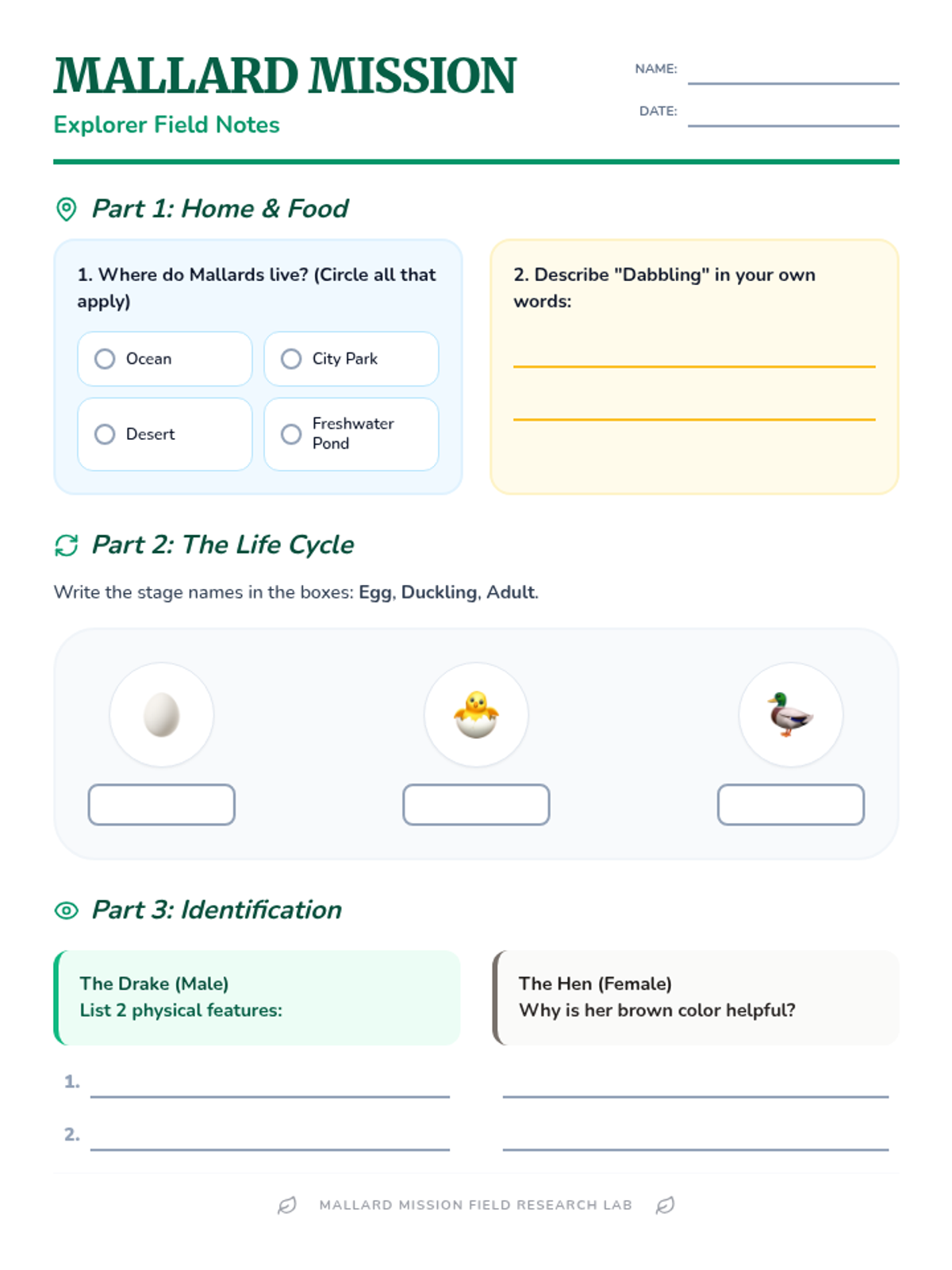 A student worksheet for the Mallard Mission lesson, featuring habitat selection, a life cycle diagram to label, and identification of male and female traits. Optimized for a single-page layout.