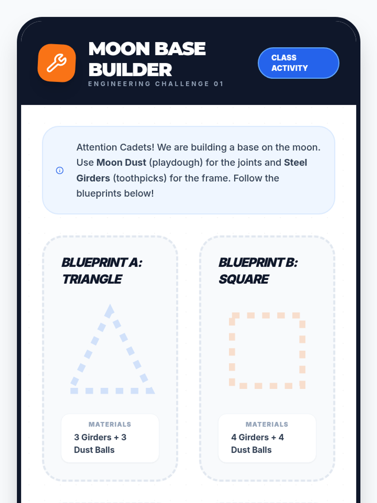 A hands-on construction activity where students build 2D and 3D shape 'skeletons' using playdough and toothpicks. Includes visual mats for triangles, squares, cubes, and pyramids.