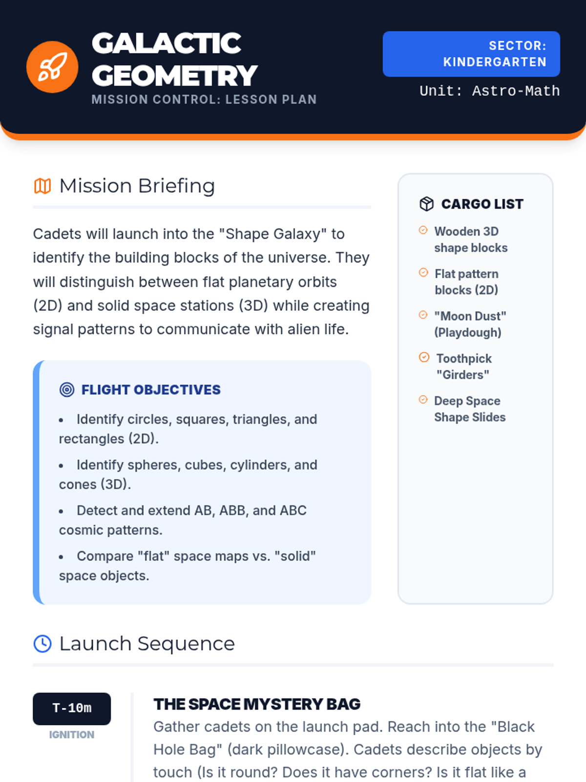 A comprehensive lesson plan for teachers, detailing the 'Galactic Geometry' curriculum. Includes learning objectives, materials list, a timed lesson flow, and specific differentiation strategies for Kindergarten 'Space Explorers'.