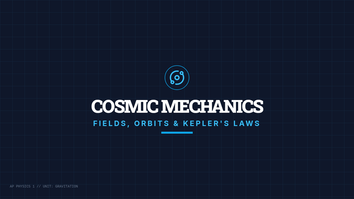 An instructional slide deck covering gravitational field strength, circular orbital mechanics, and Kepler's Third Law with visual diagrams and derivations.