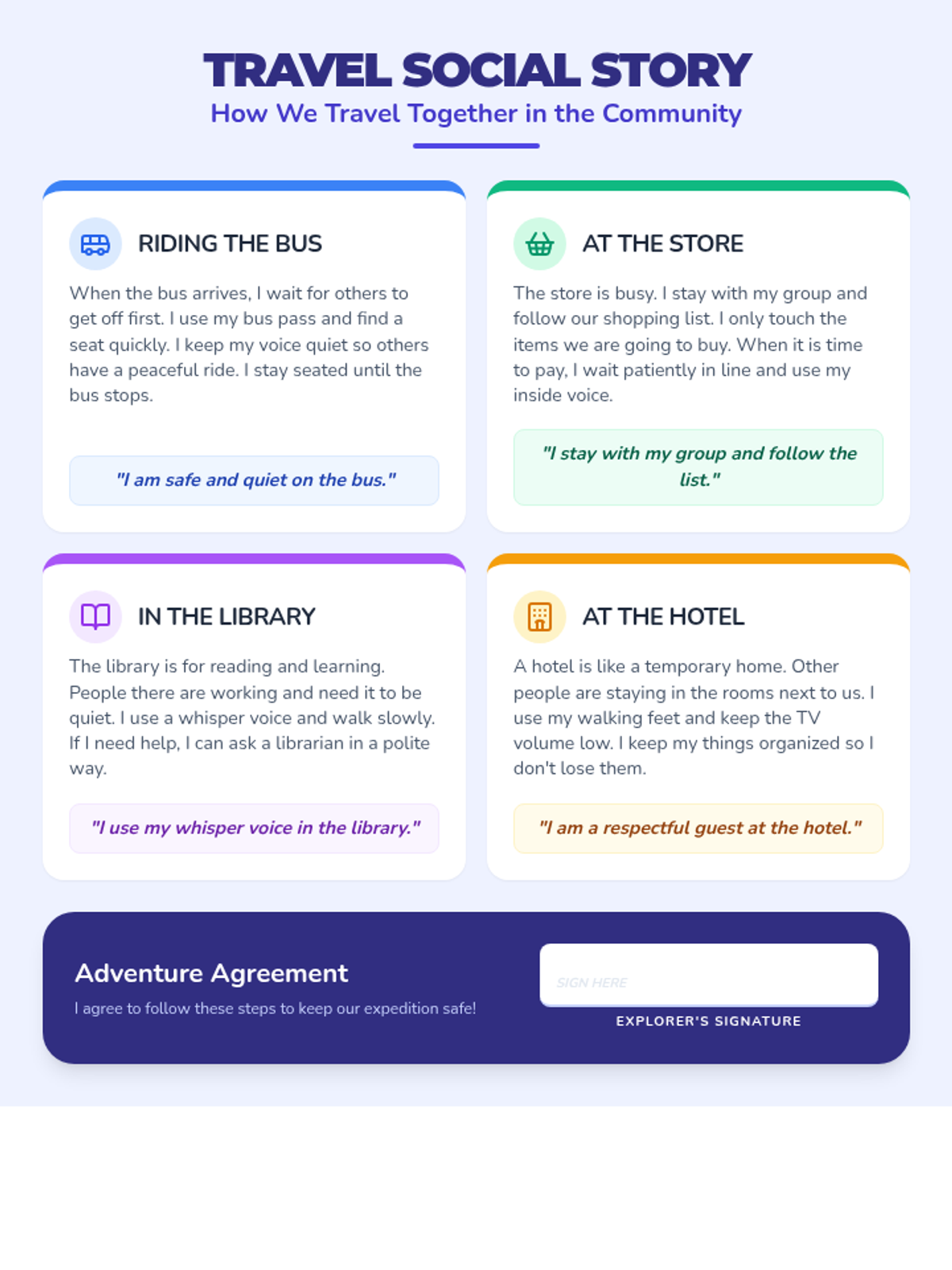 A visual social story for community travel, outlining clear social expectations and behavior protocols for buses, stores, libraries, and hotels, fitting entirely on one page.