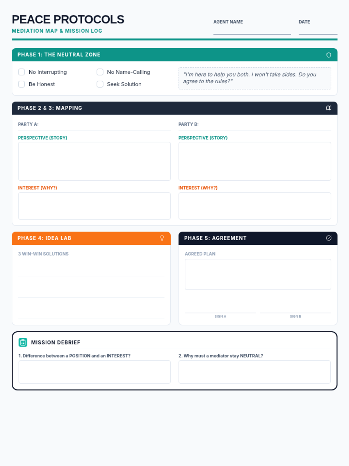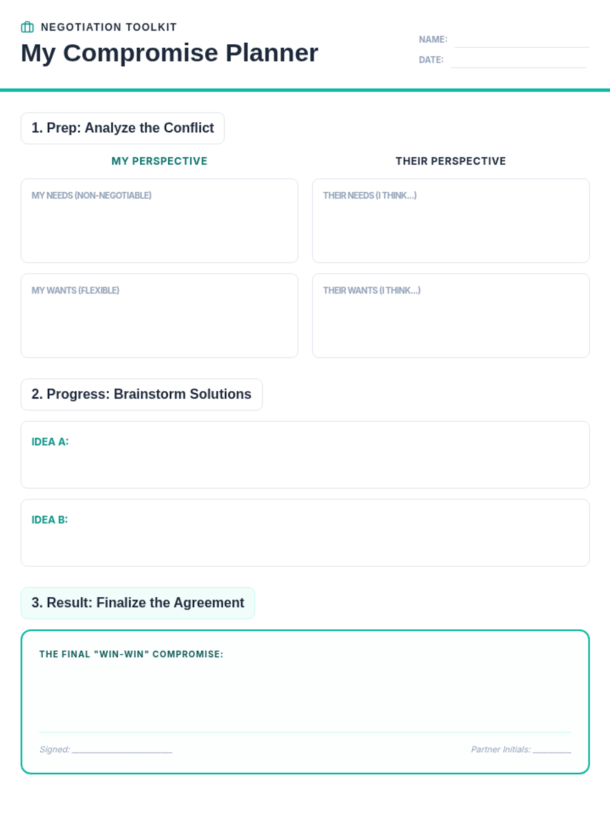 A structured graphic organizer that guides students through the negotiation process by helping them identify needs vs. wants, brainstorm alternatives, and document a final 'win-win' compromise.