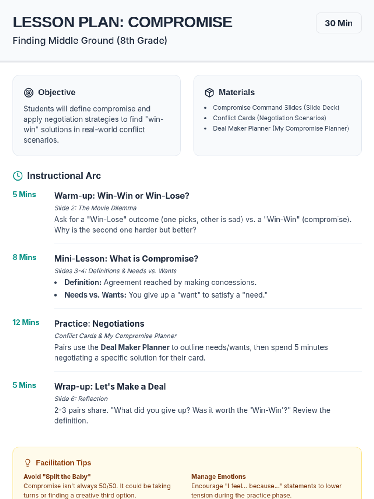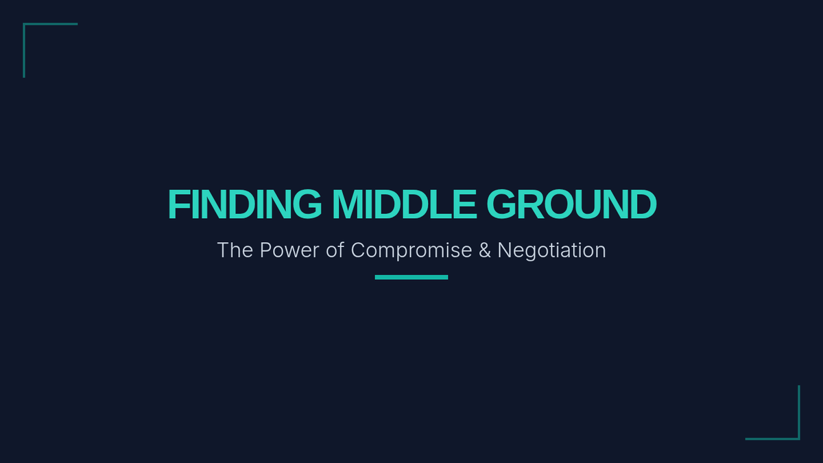A dynamic 6-slide presentation for 8th-grade instruction, covering the definition of compromise, the 'needs vs. wants' framework, and the steps for effective negotiation.