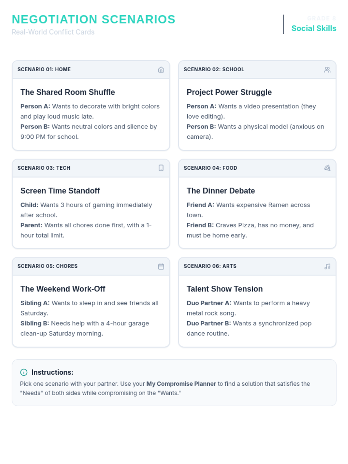 A set of six relatable conflict scenarios for 8th-grade students, ranging from sibling disputes to group project disagreements, designed for pair-work negotiation practice.