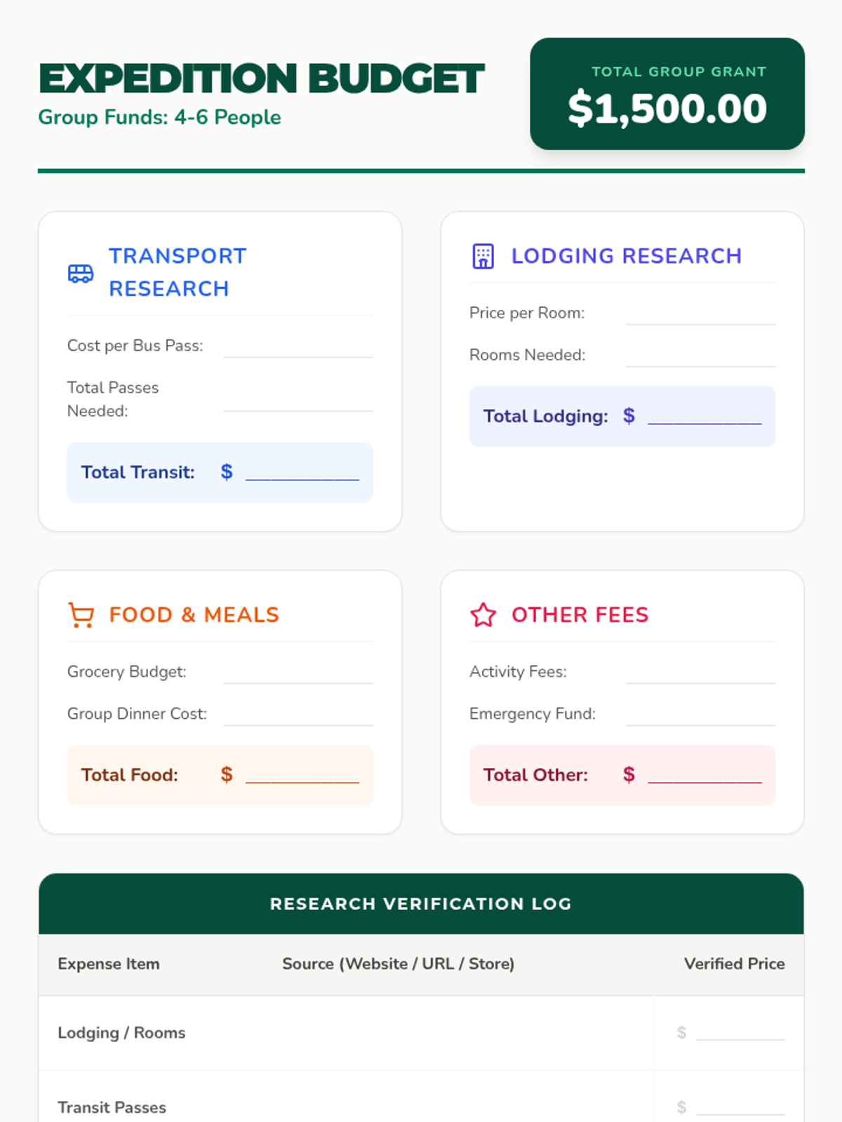 A research-based budget expense tracker for a 4-6 person community trip with a $1,500 grant, including a verification log for students to record their sources and prices. Fixes alignment and page break issues.