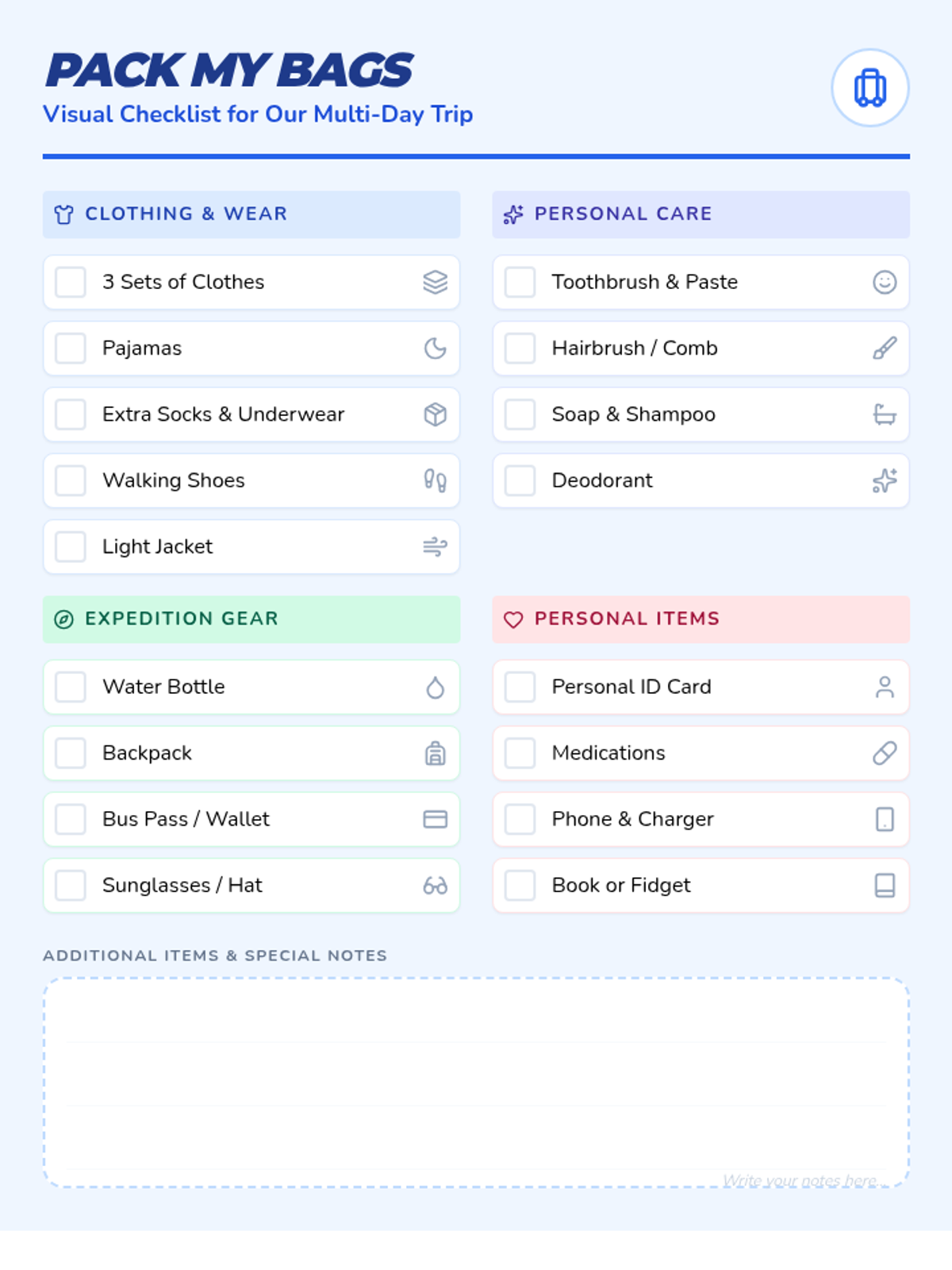 A visually-supported packing checklist designed for students, featuring categorized items with consistent Lucide icons and an expanded notes section for personal trip preparation.