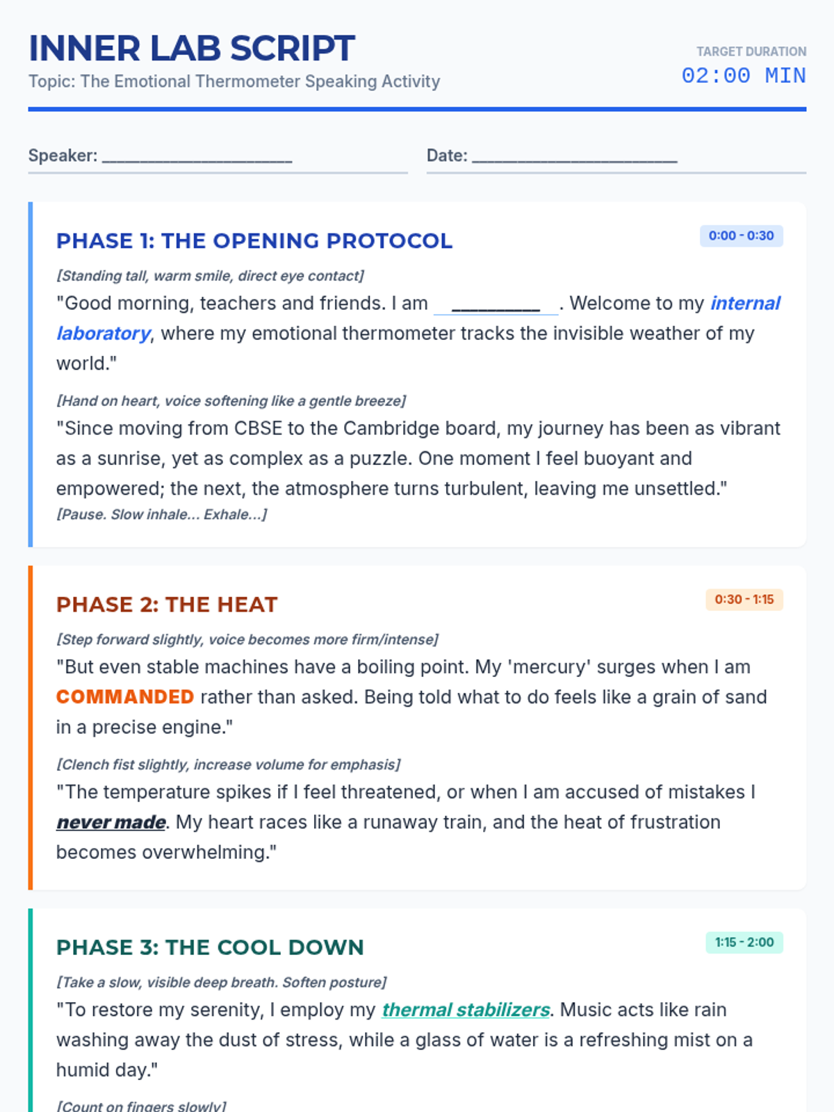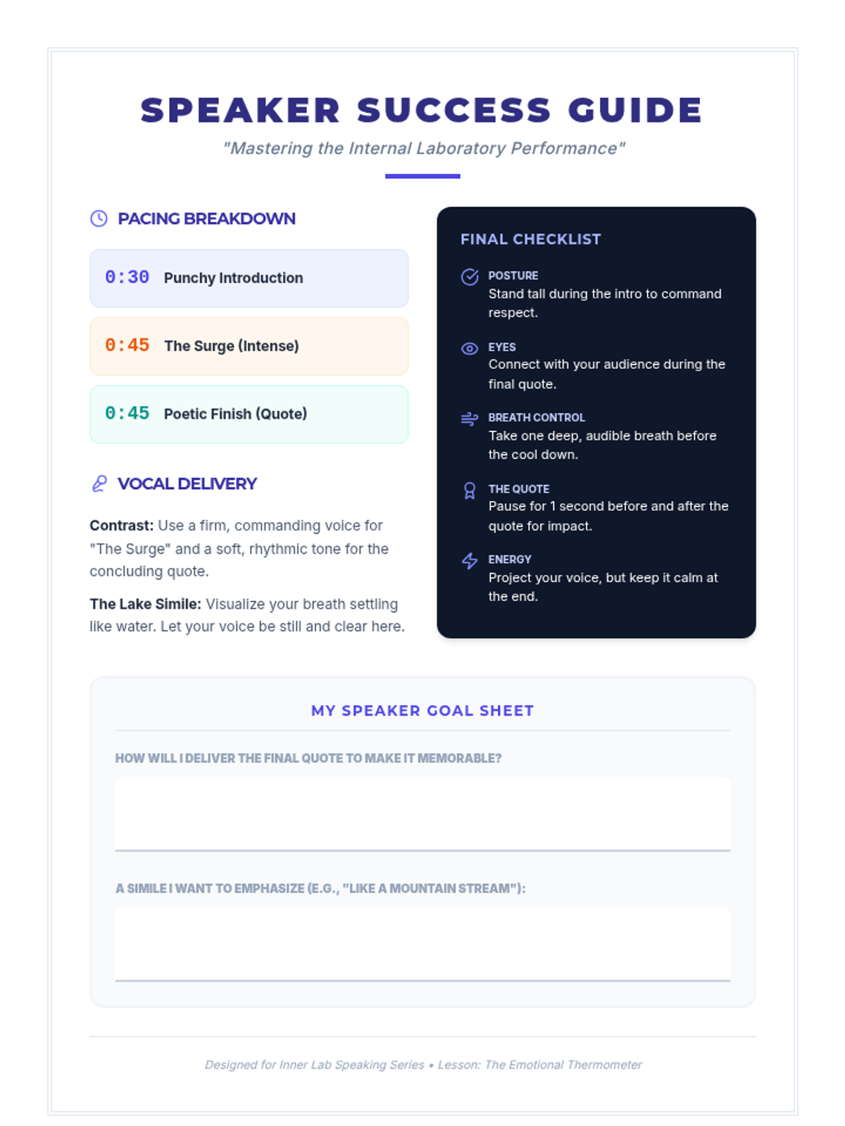 A preparation guide for speakers, updated to include tips for delivering the revised poetic intro and ending, with dedicated space for quote delivery practice. Student work areas have been enlarged for better accessibility.