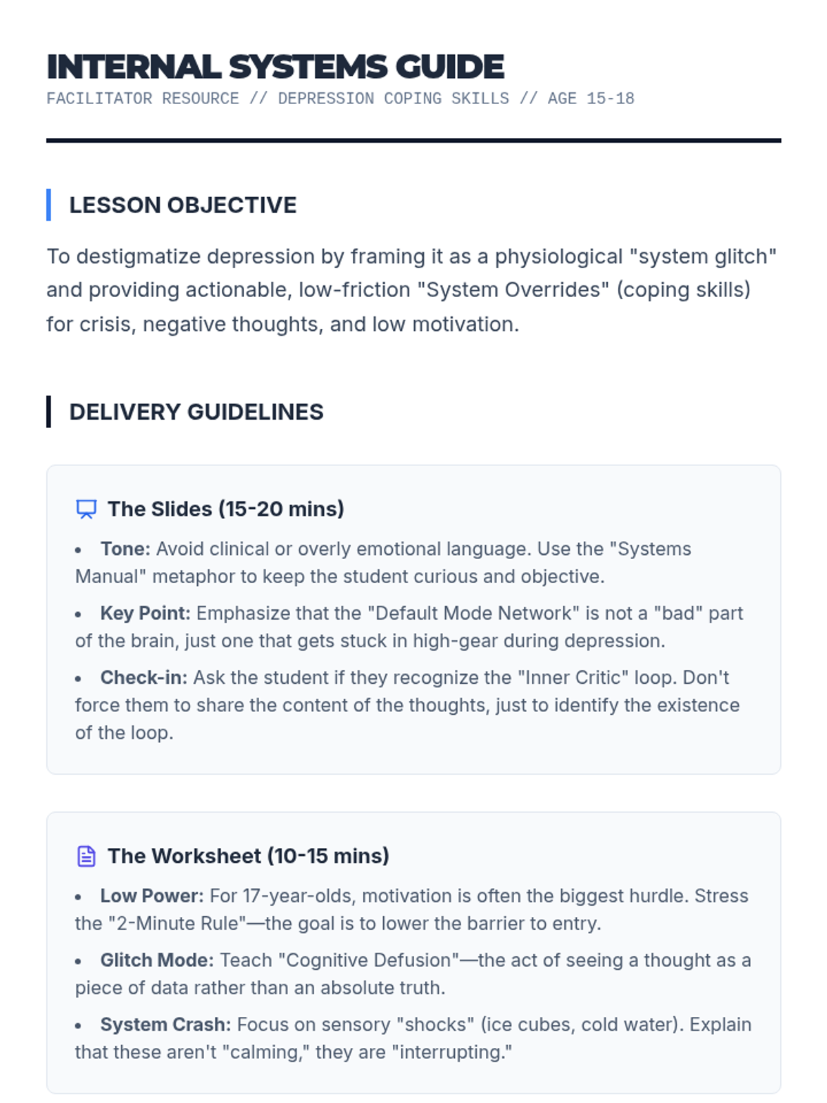 A facilitator guide for teachers or counselors delivering the Neuro Blueprint lesson. Includes instructional tips, delivery guidelines for slides and worksheets, and safety protocols for working with depressed teens.