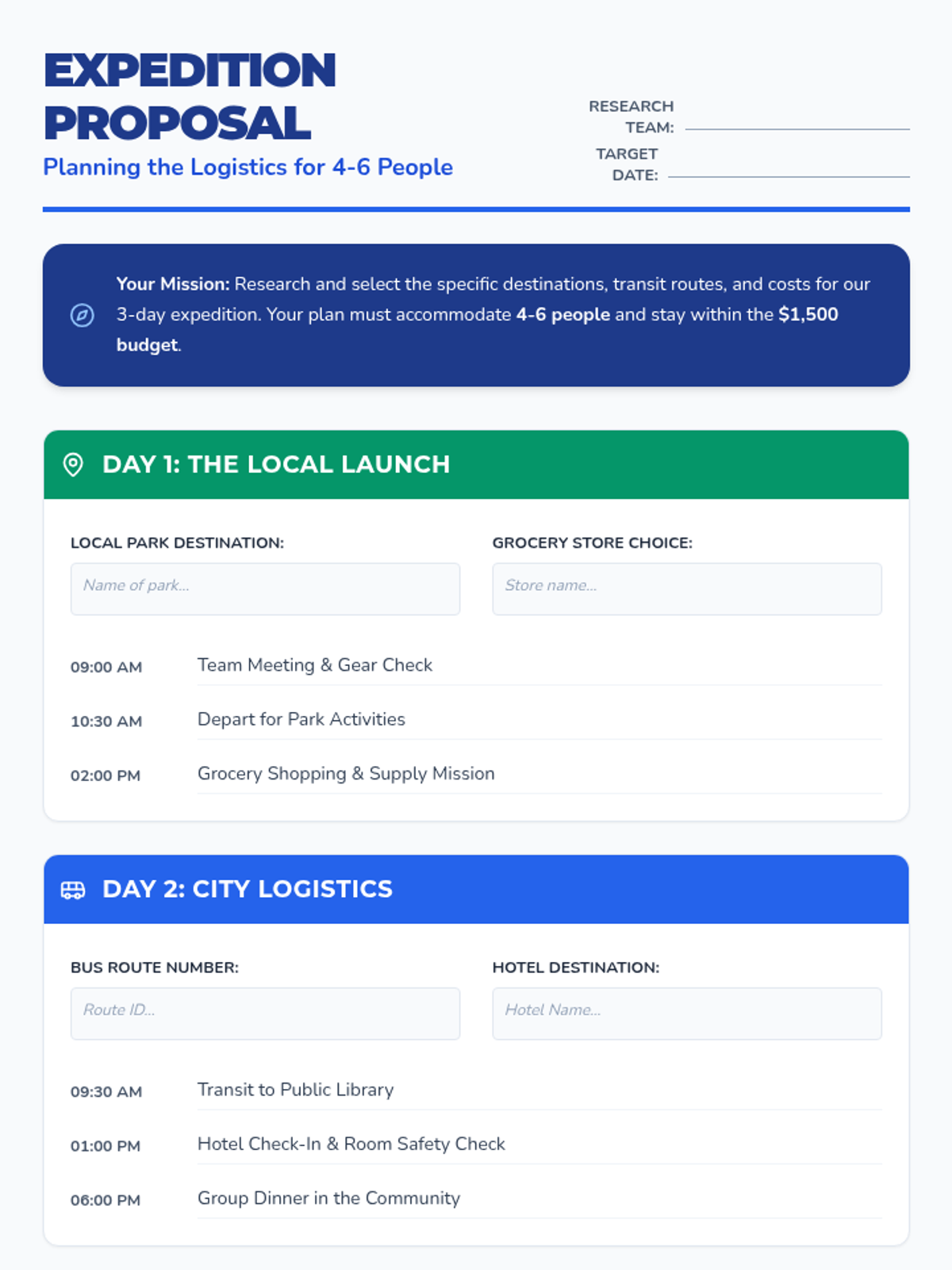 An expedition planning itinerary that requires students to research specific locations, bus routes, and hotel options for a group of 4-6 people. Includes research areas for all 3 days.