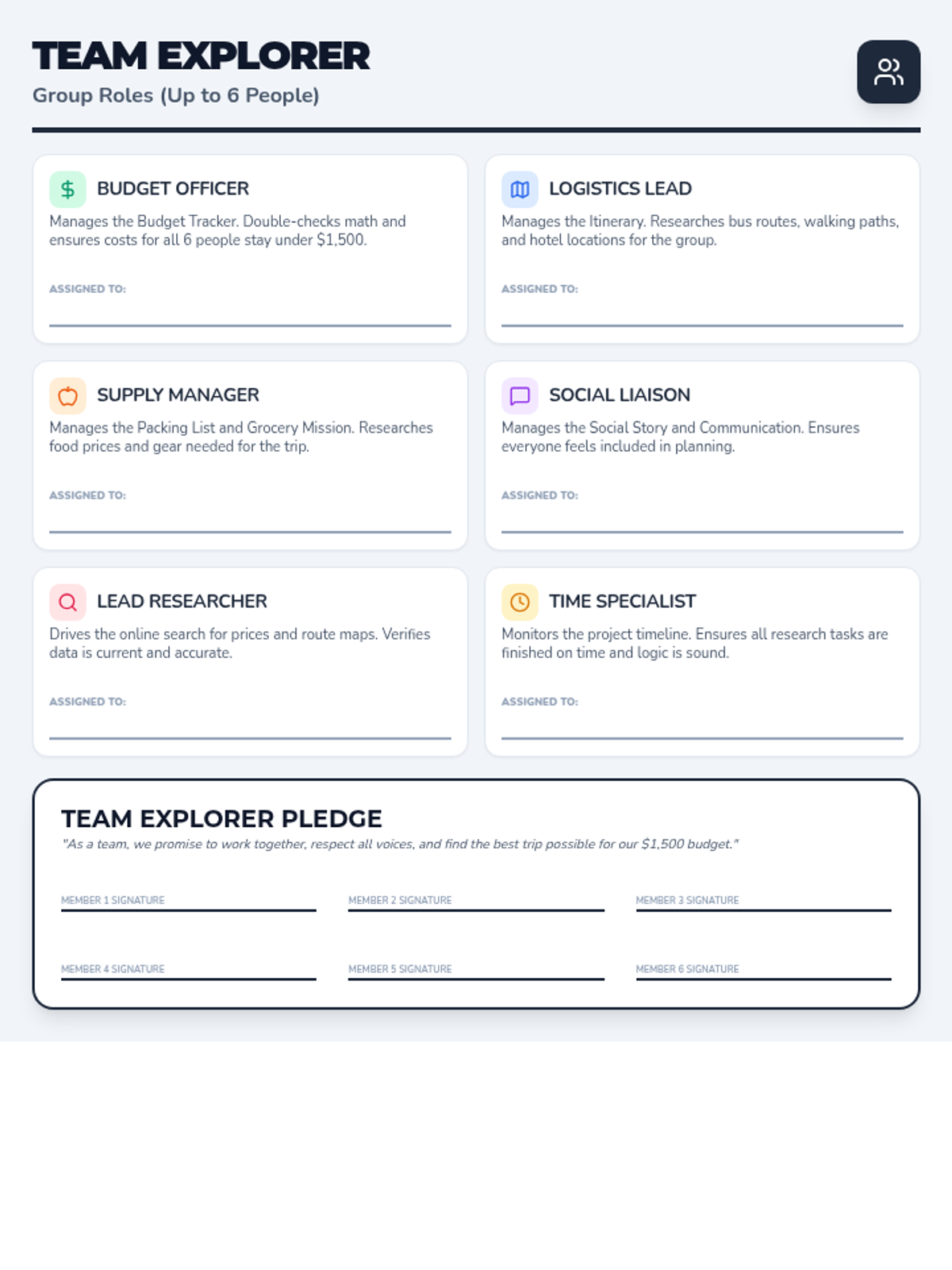 A group roles organizer for 4-6 students to assign specific responsibilities for their community trip research project. Includes 6 distinct roles and a team pledge. Fixes page break and legibility issues.