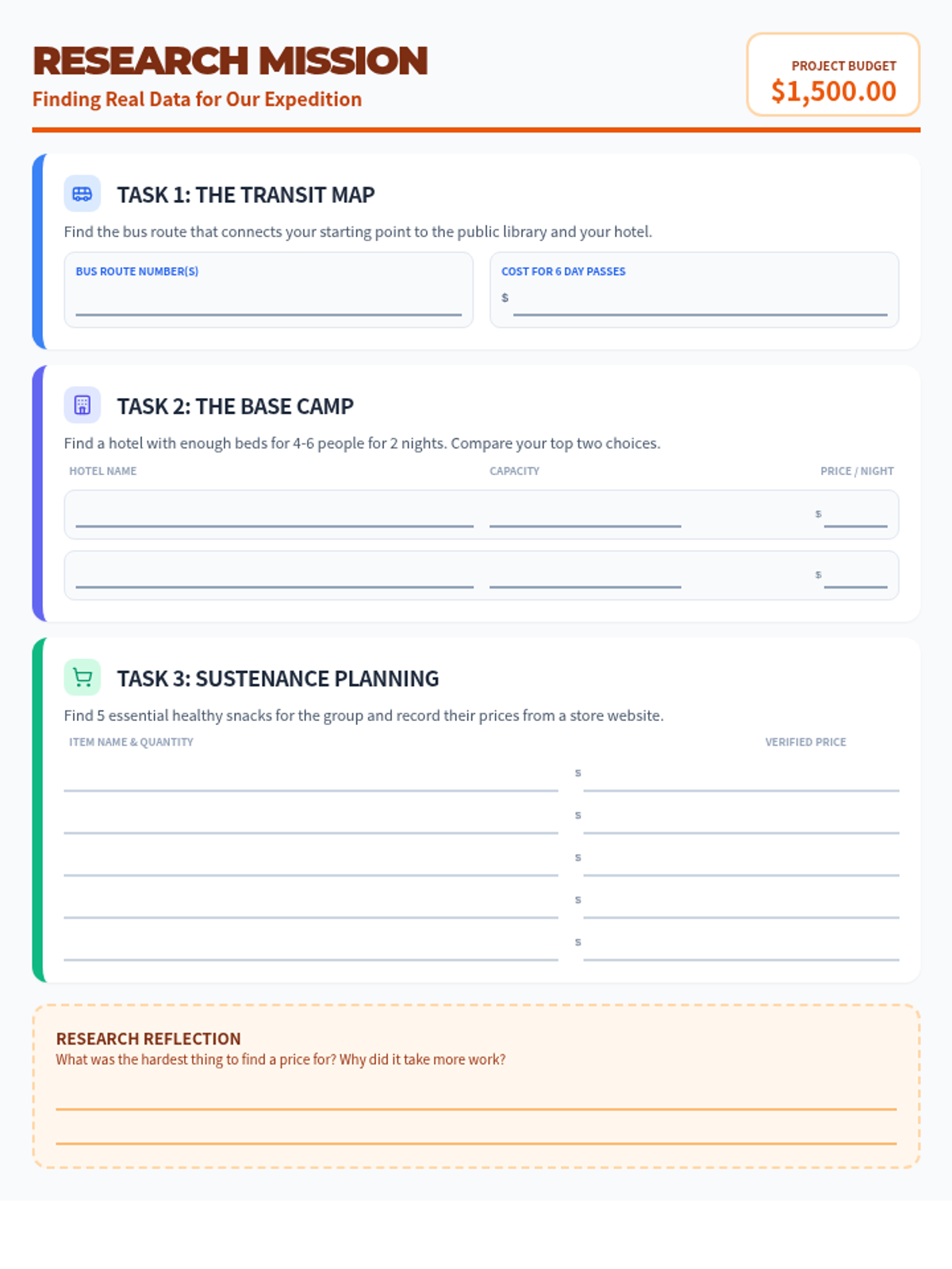 A step-by-step research guide for students to find real-world costs for transit, lodging, and groceries as part of their community trip project. Fixes layout and content completeness issues.