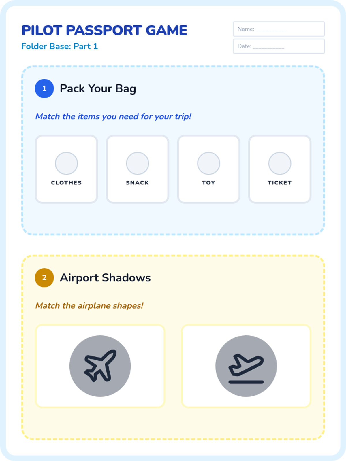 A printable interactive file folder game designed for students with autism, focusing on fine motor skills through cutting, matching, and finger tracing activities related to air travel.
