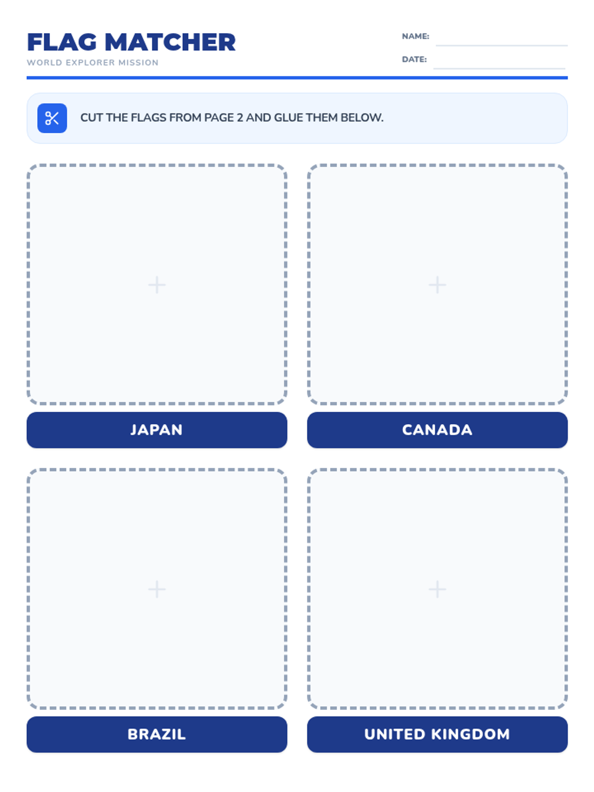 A structured two-page cut-and-paste worksheet for identifying world flags. Page 1 features a clear grid with country labels, and Page 2 provides simplified flag graphics for cutting, designed with high contrast and minimal distractions.