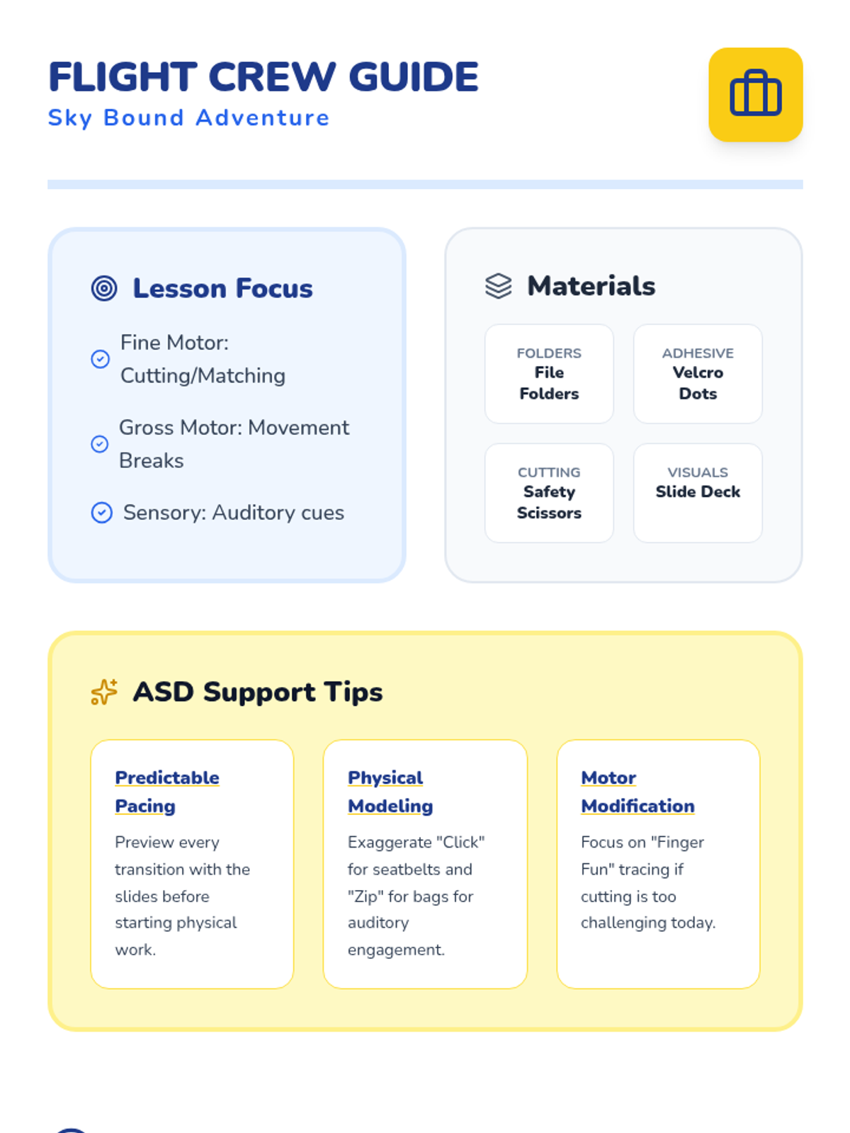 A comprehensive teacher's guide for implementing the Sky Bound lesson, providing instructional strategies, materials lists, and ASD-specific accommodations.