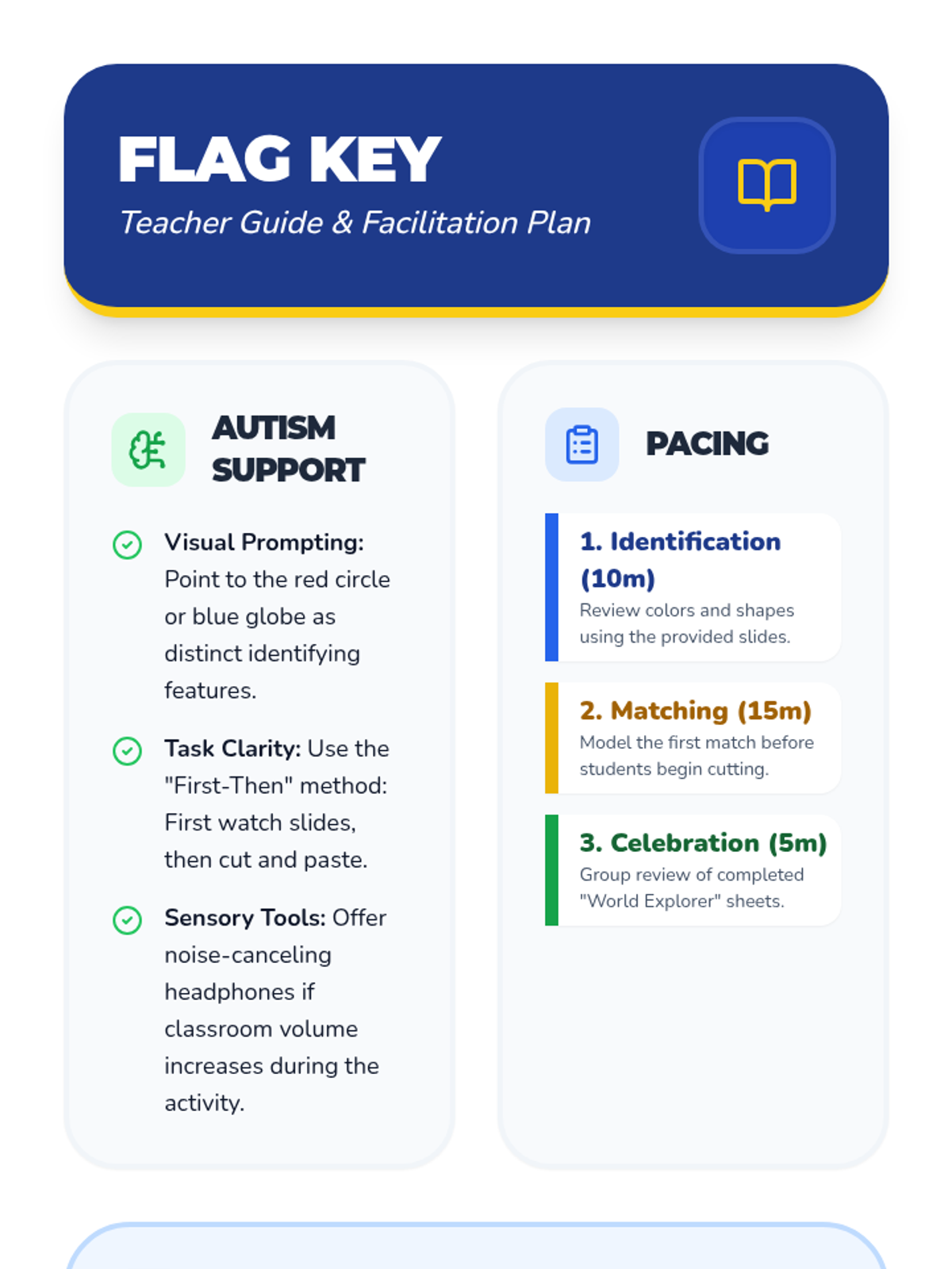 A comprehensive teacher's guide for the Flag Finders lesson, featuring specific instructional strategies for students with autism, a clear lesson flow, a visual answer key, and differentiation tips for various learner needs.