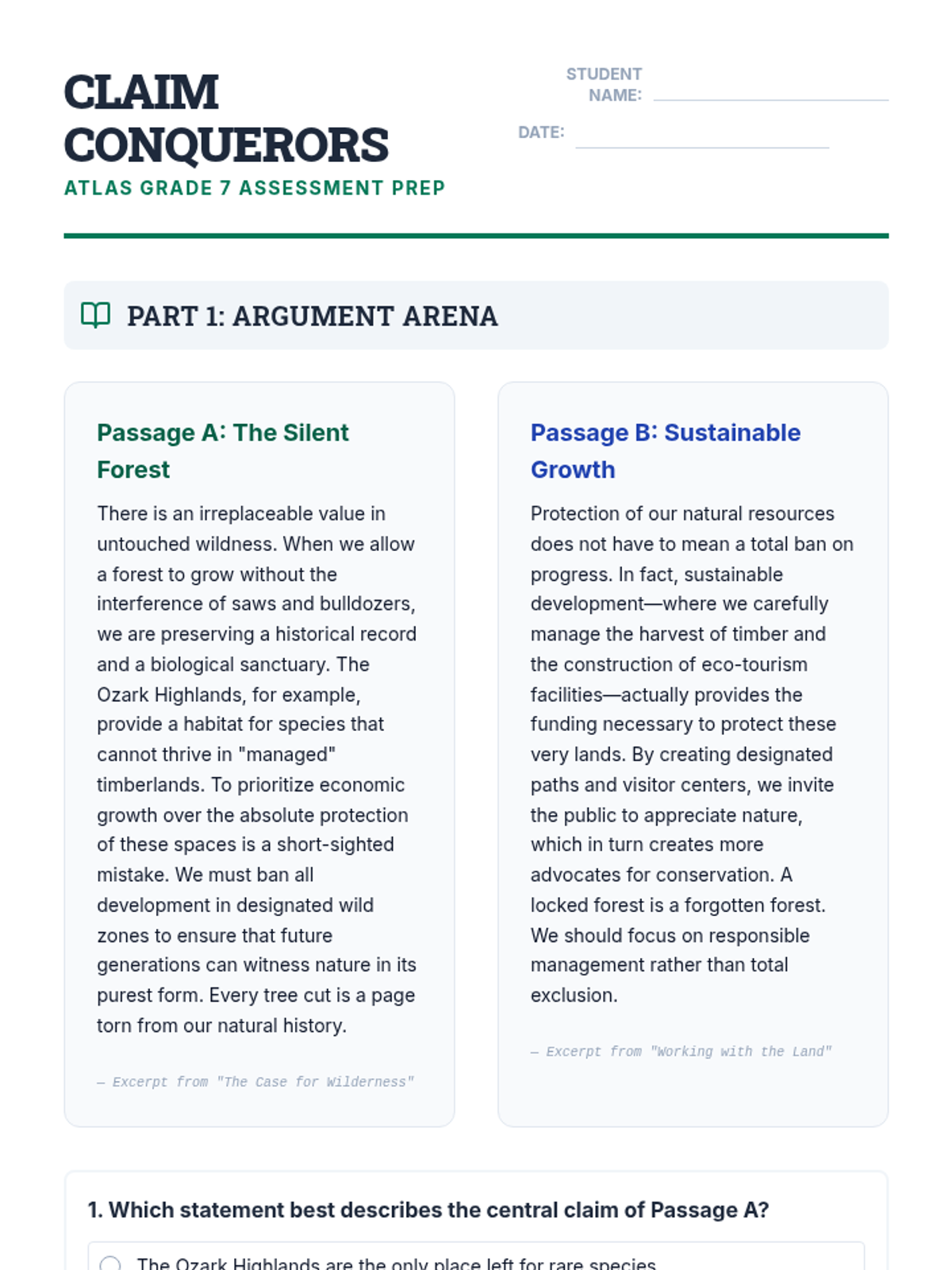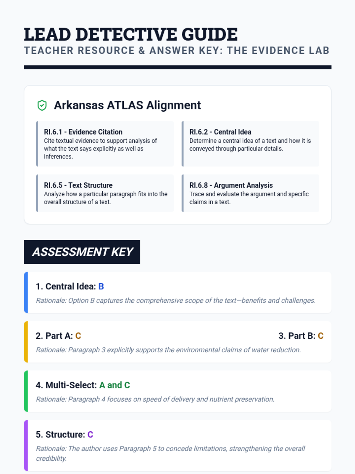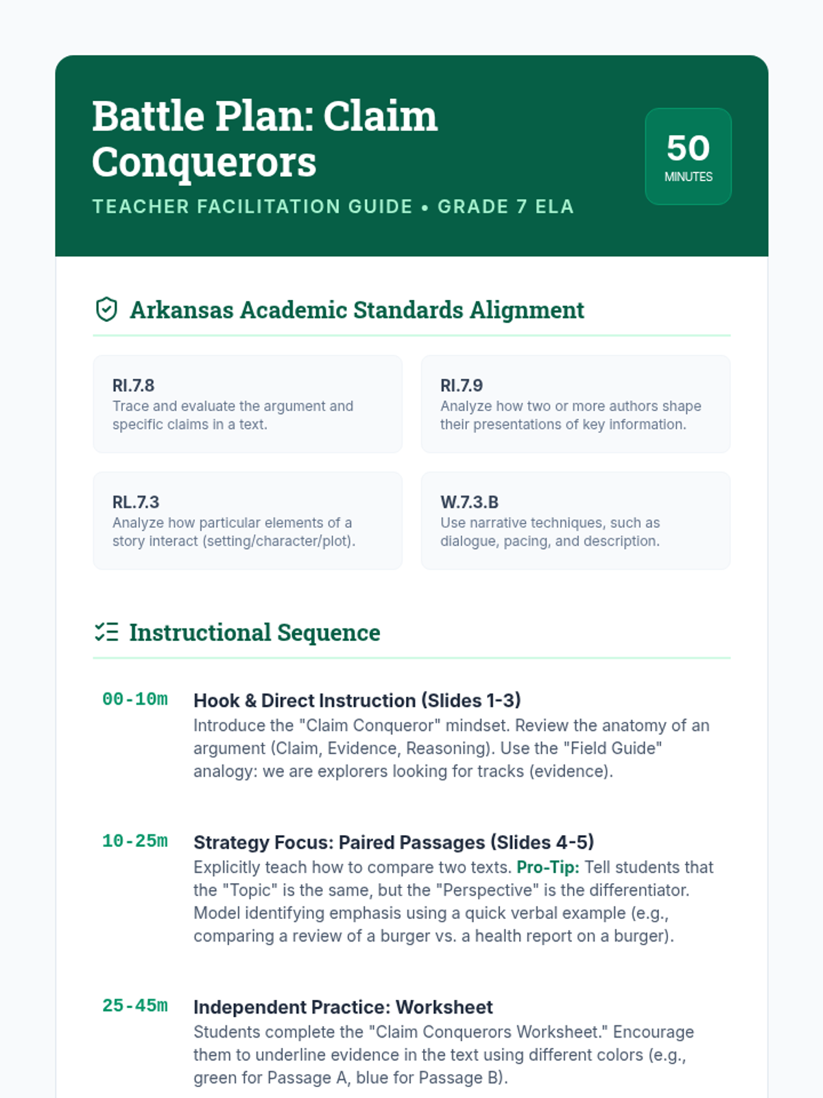 A comprehensive teacher facilitation guide for the Claim Conquerors lesson. Includes Arkansas ELA standards alignment, a 50-minute lesson sequence, differentiation strategies, and high-level discussion prompts.