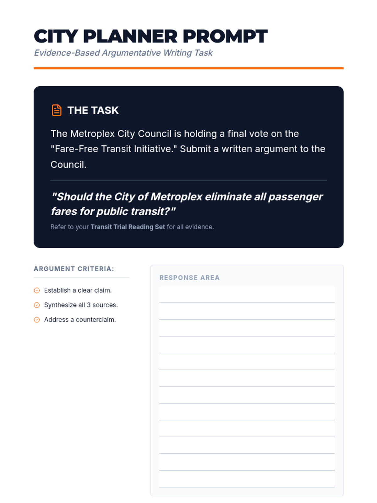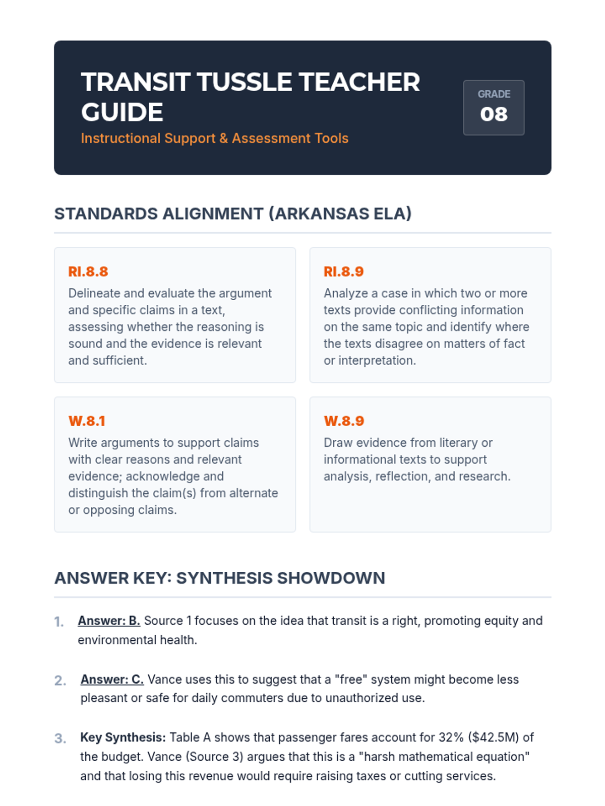 A comprehensive teacher's guide for the "Transit Tussle" lesson, including ELA standards alignment, an answer key for student activities, and a grading rubric for argumentative writing.
