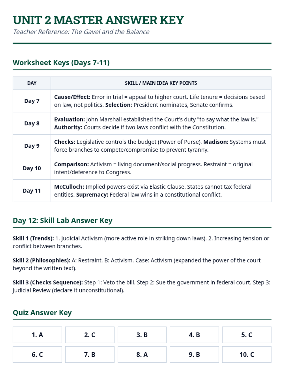 Teacher Master Answer Key for Unit 2 (The Gavel and the Balance). Includes answer points for Days 7-11 worksheets, the Day 12 Skill Lab, and the unit comprehension quiz.