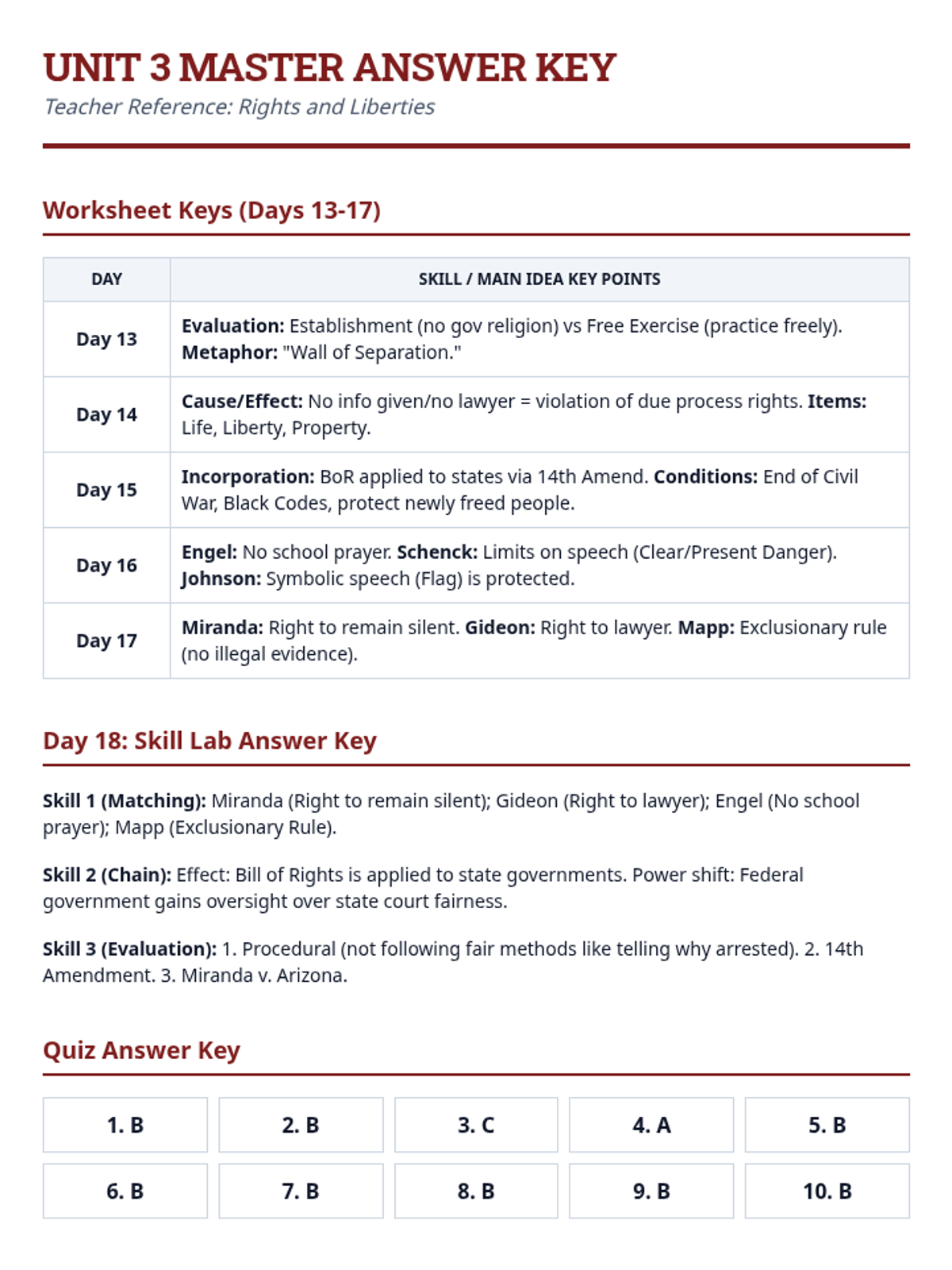 Teacher Master Answer Key for Unit 3 (Rights and Liberties). Includes answer points for Days 13-17 worksheets, the Day 18 Skill Lab, and the unit comprehension quiz.