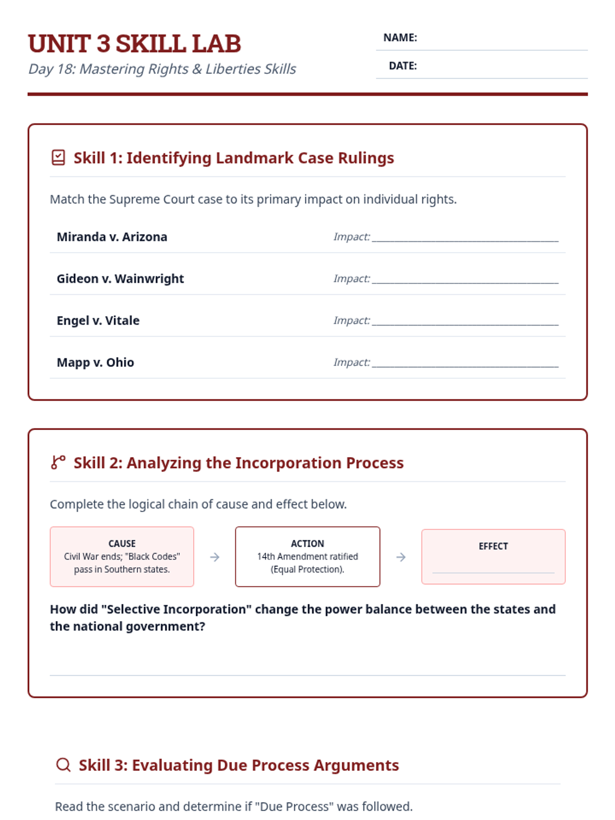 Day 18 Skill Lab for Unit 3. Features case matching for landmark SCOTUS decisions, analyzing the cause-and-effect chain of incorporation, and evaluating a due process scenario.