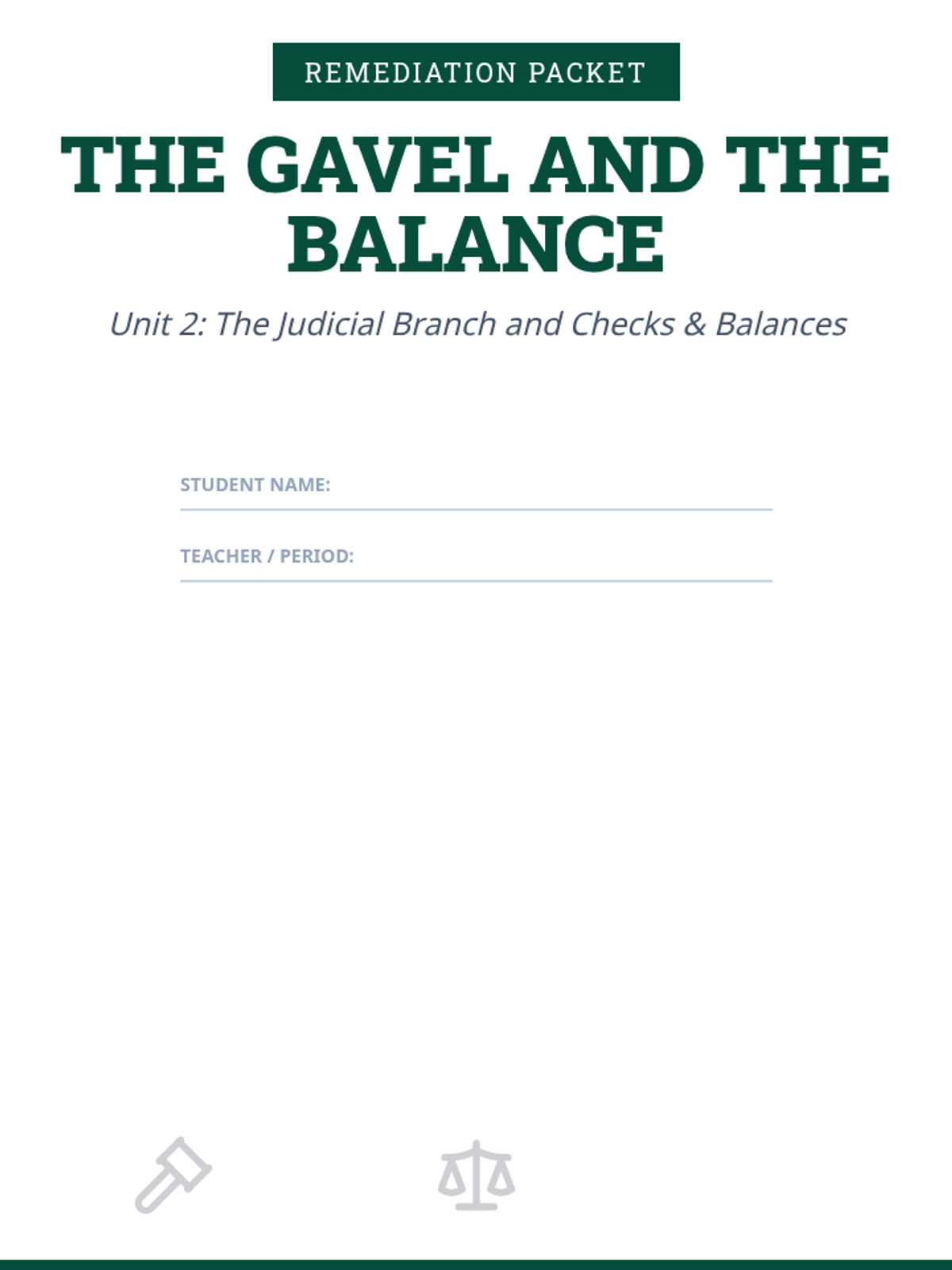 Consolidated Master Packet for Unit 2: The Gavel and the Balance. Includes 6 days of readers and worksheets, a skill lab, unit quiz, and answer key in one continuous document.