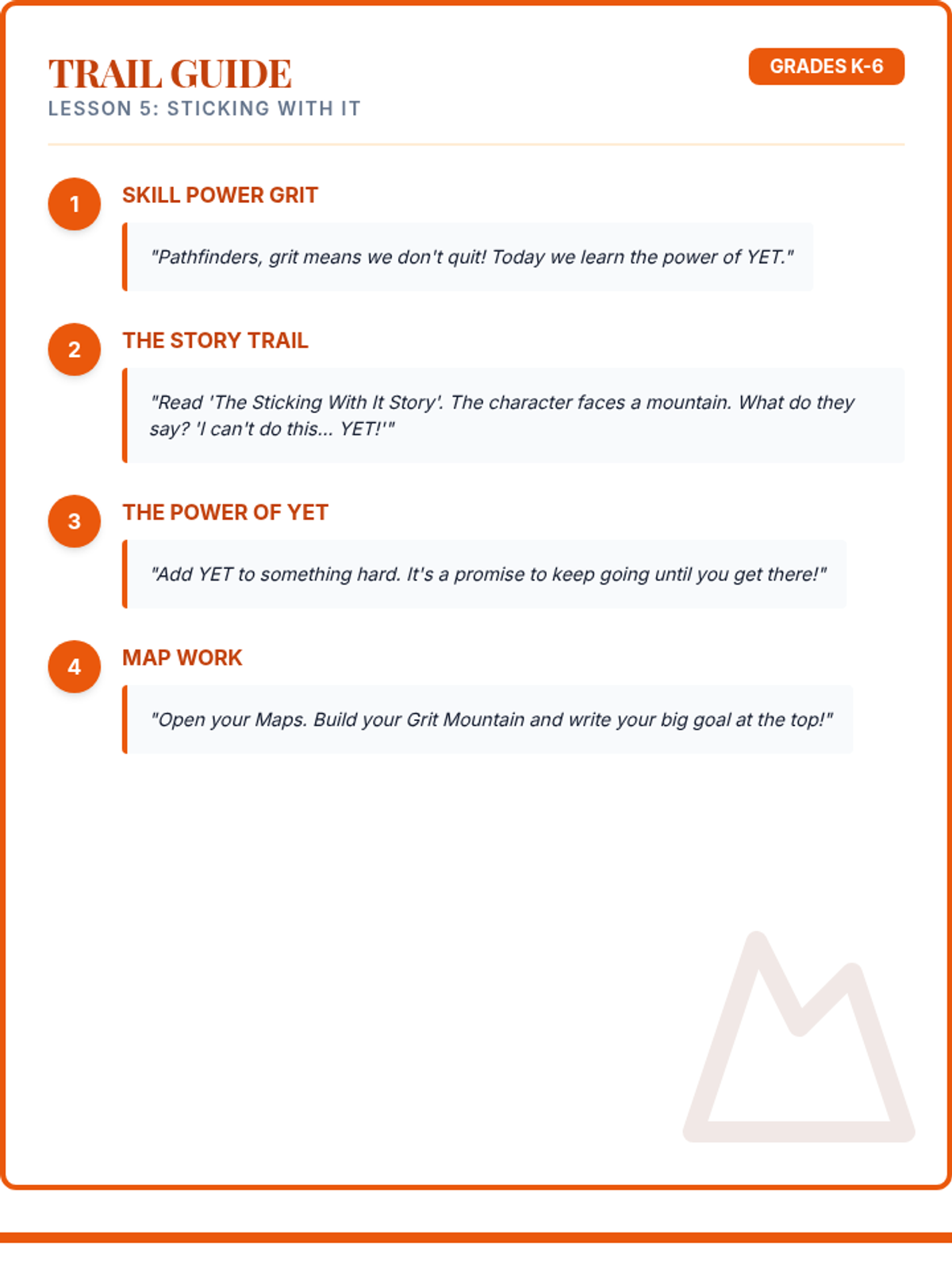 Facilitator script and student workbook for the Gritty Ninja lesson, featuring the 'Power of Yet' and building perseverance in K-6 students. Revised for single-page workbook layout and improved facilitator script flow.