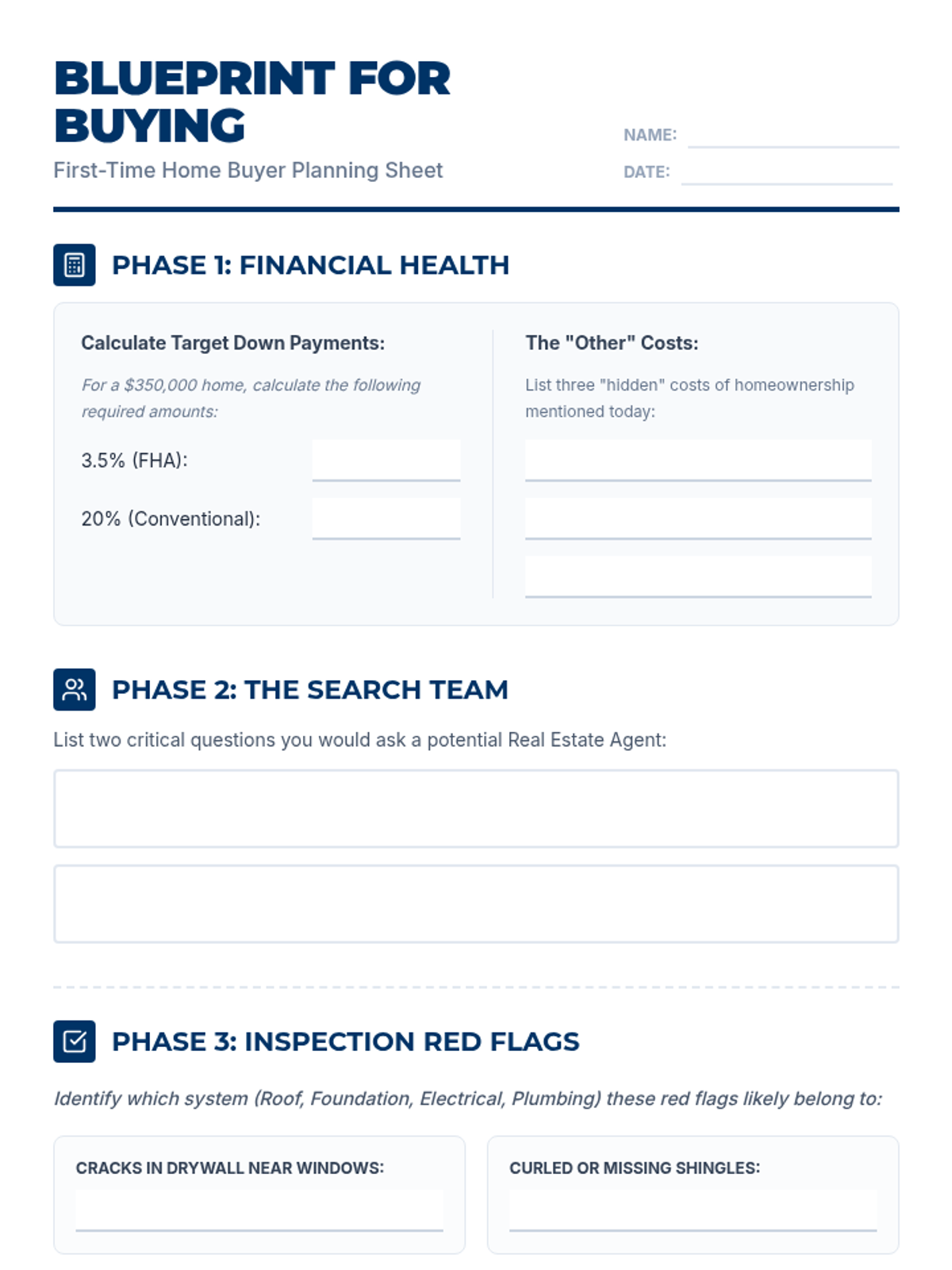 A practical worksheet for students to apply home buying concepts, including down payment calculations, agent interview prep, inspection red flag identification, and a process timeline activity. Revised for better spacing and page flow.