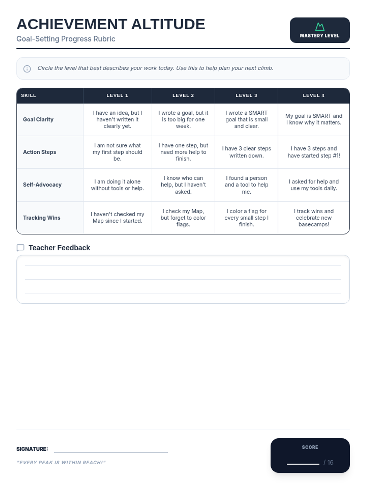 An assessment rubric that translates goal-setting proficiency into 'altitude' levels. It assesses goal clarity, action steps, self-advocacy, and progress tracking, suitable for both self-assessment and teacher grading.