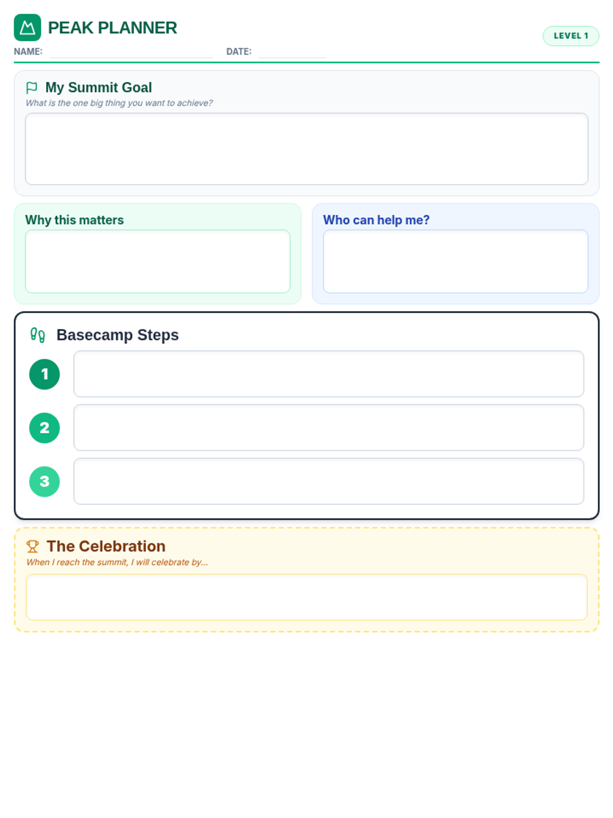 A student-facing worksheet for planning a single academic or behavioral goal. It uses simplified language and visual scaffolding to help students identify their 'summit' and break it into three small 'basecamp' steps.
