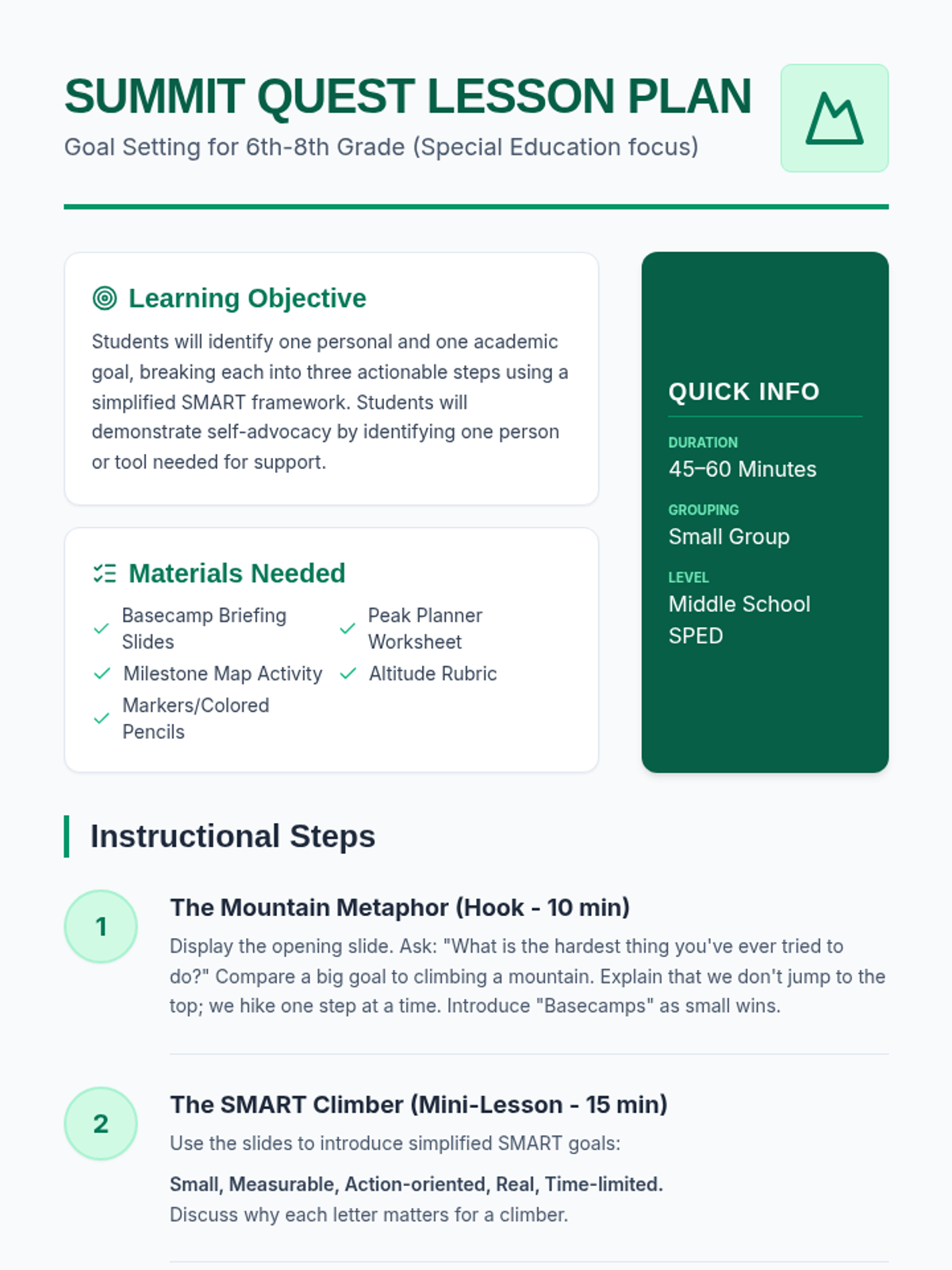 A comprehensive lesson plan for teachers, outlining a mountain-themed approach to goal setting for 6th-8th grade special education students, including instructional steps, differentiation strategies, and learning objectives.