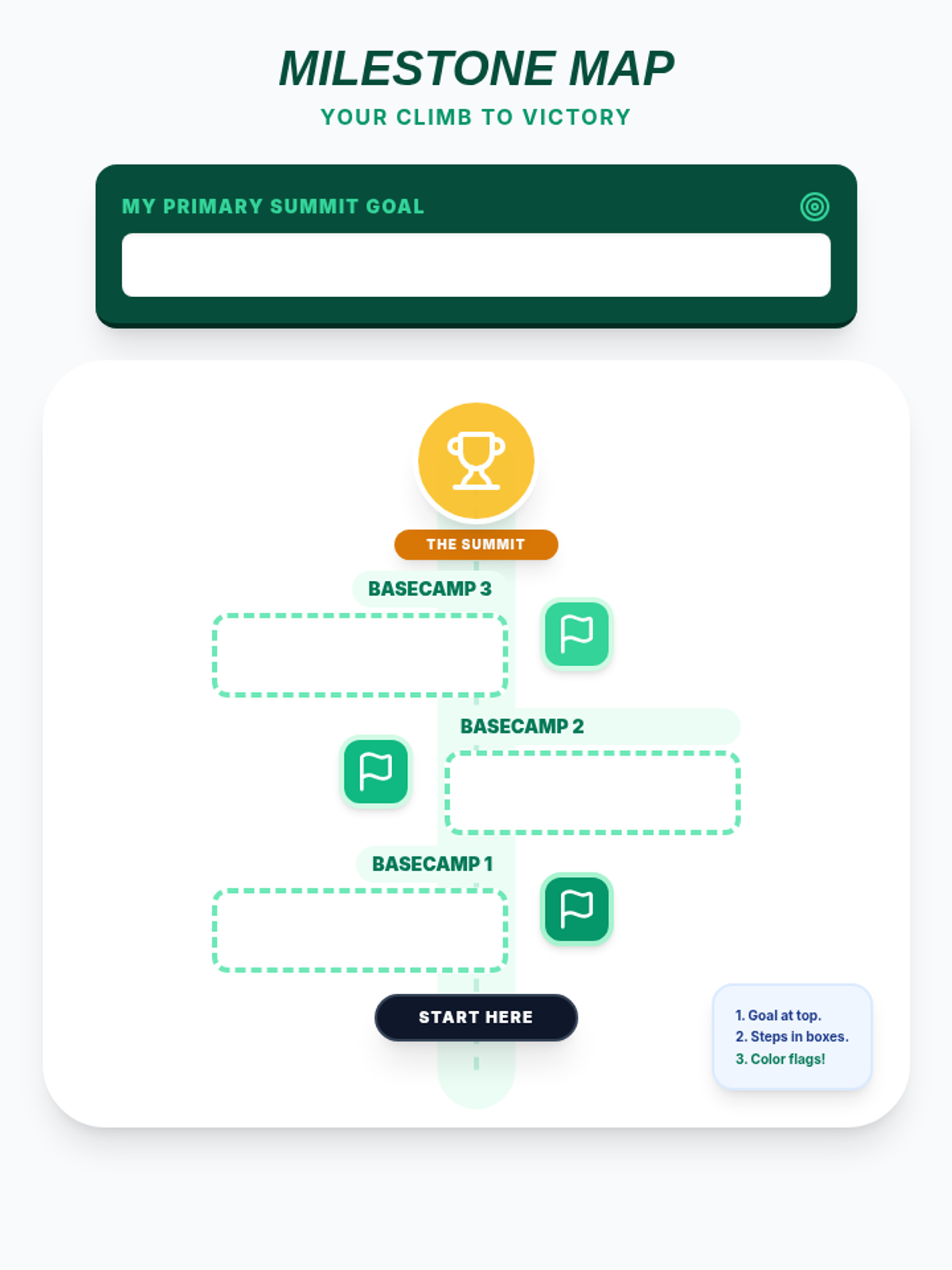 A visual progress tracking activity sheet that acts as a 'map' for students' goal-setting journeys. Students write their steps next to flags on a mountain path and color them in as they achieve each milestone.
