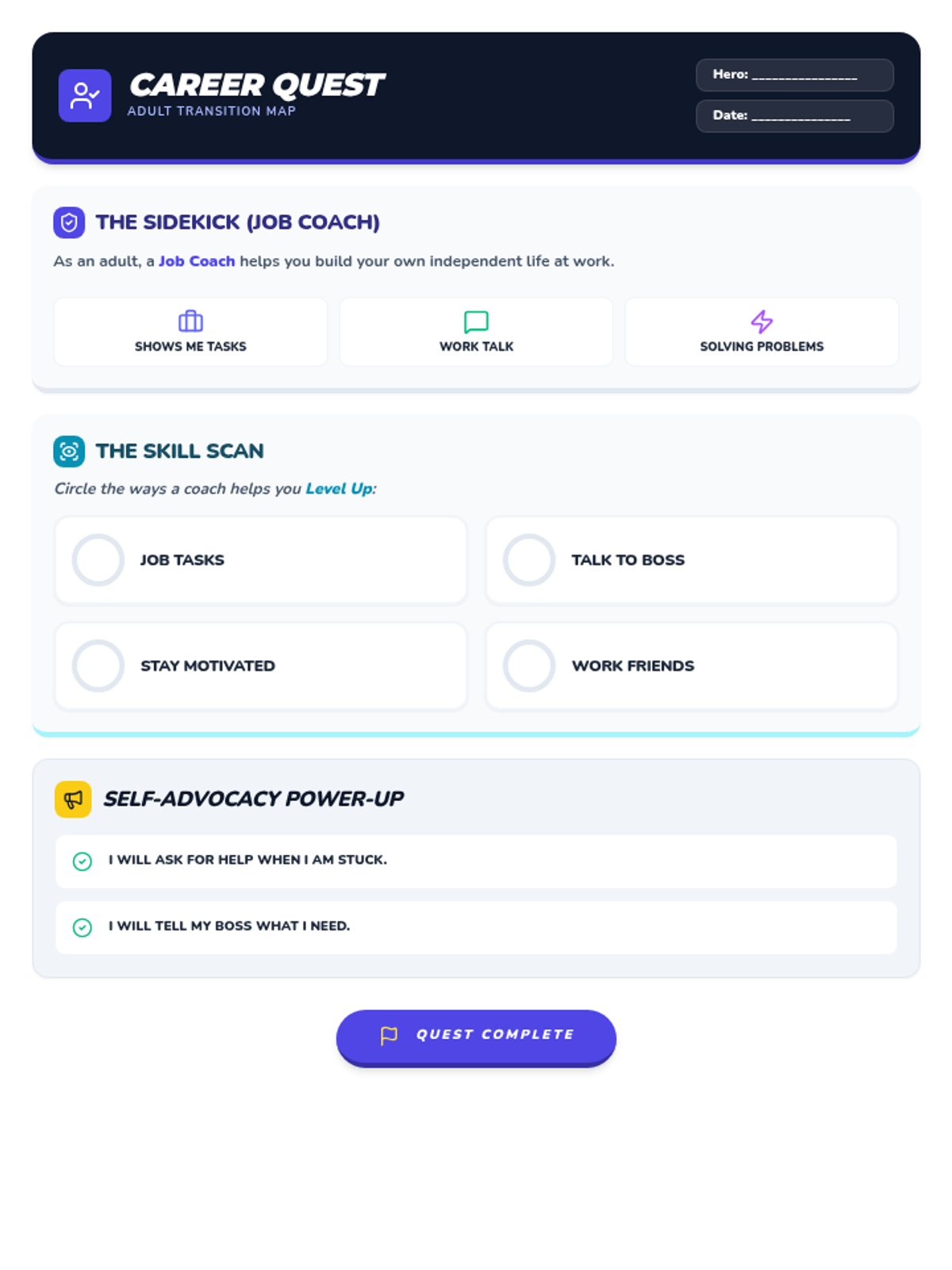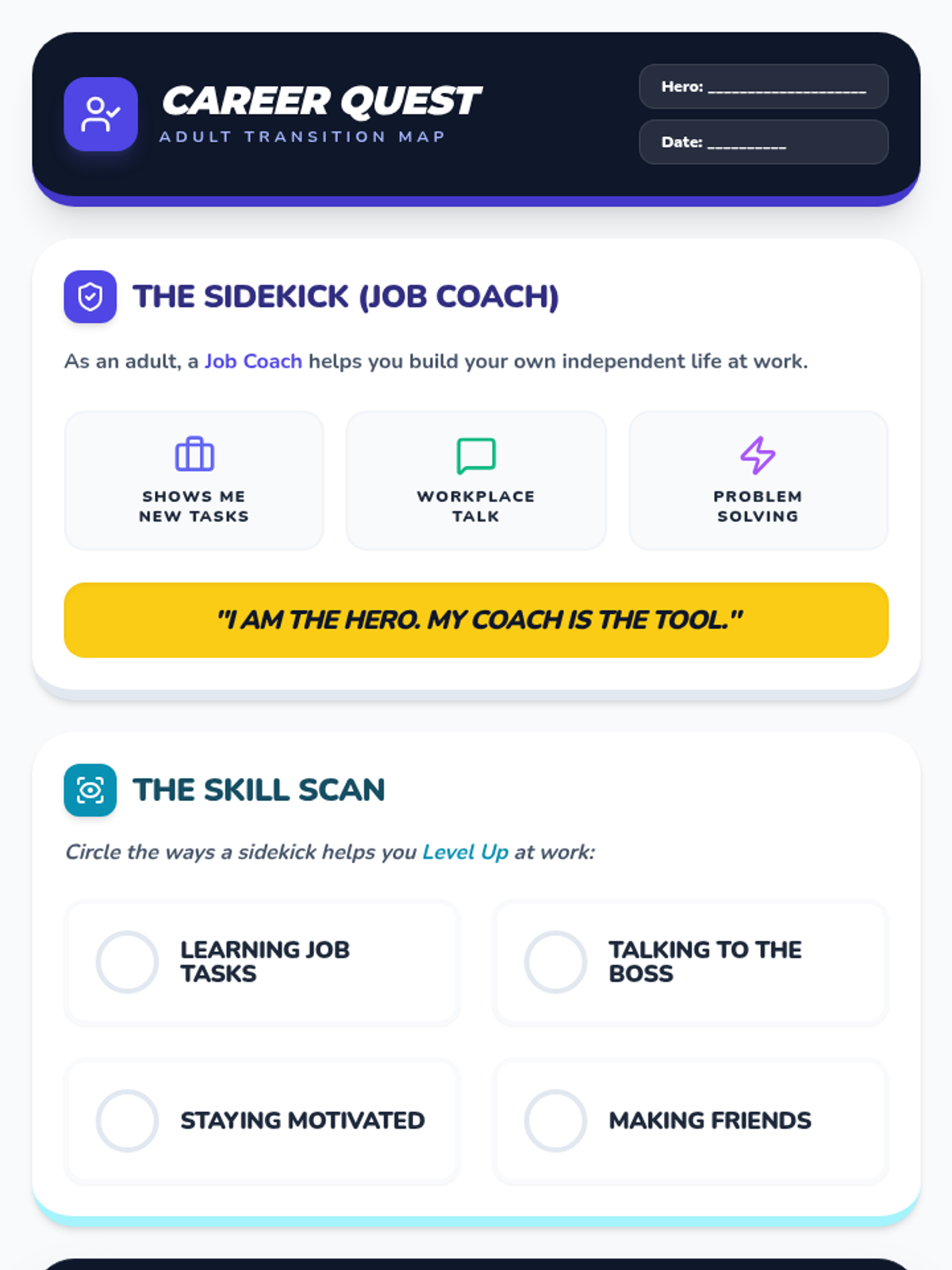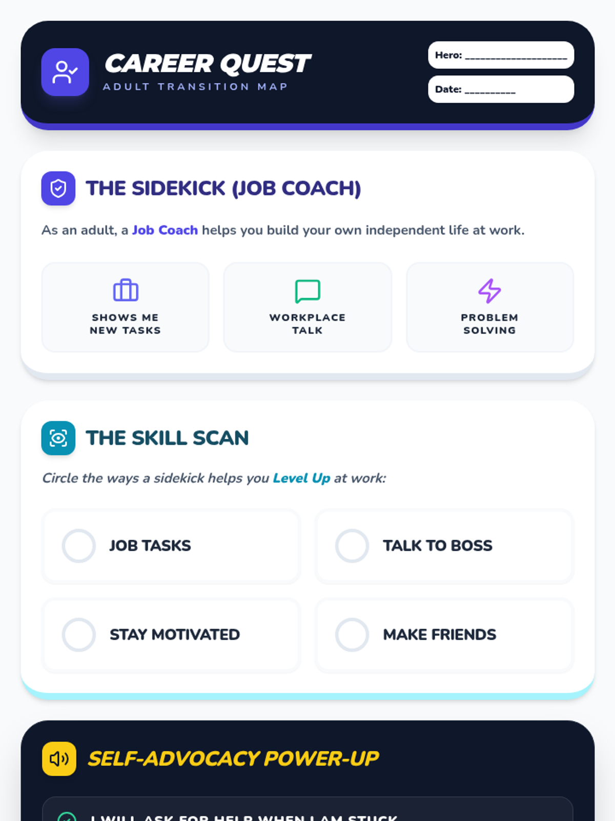 A themed adult vocational handout designed as a 'Transition Map' for adults with IDD. Reframes job coaching and vocational services as 'Sidekicks' and 'Self-Advocacy Power-Ups'. Includes a definition of an adult job coach, a circling activity for workplace success, and a self-advocacy commitment checklist. Designed for post-school adult programs. Optimized for a single page.