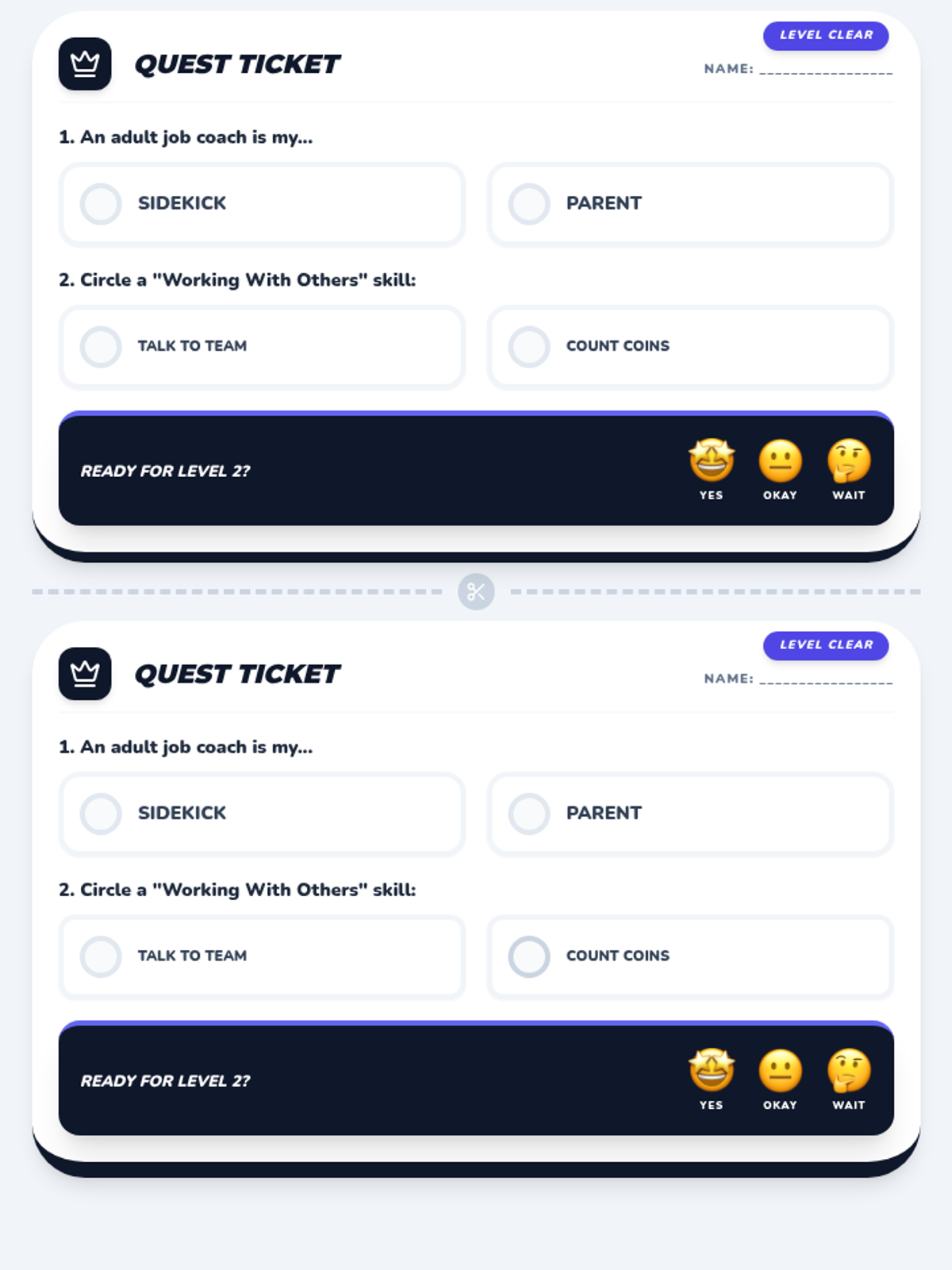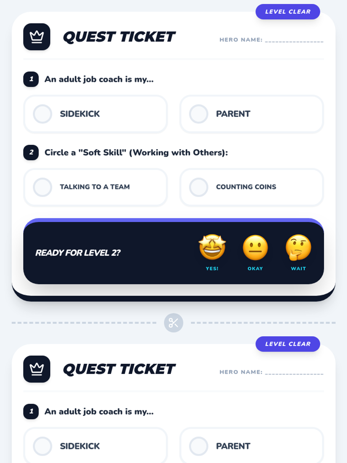 Adult-themed vocational exit tickets for transition programs. Reframes the student as a 'Hero' finishing a level of training. Questions focus on the role of a job coach (Sidekick) and identifying workplace soft skills (Working with Others). Includes emoji-based self-reflection for adult confidence tracking. Optimized for 2-per-page printing.