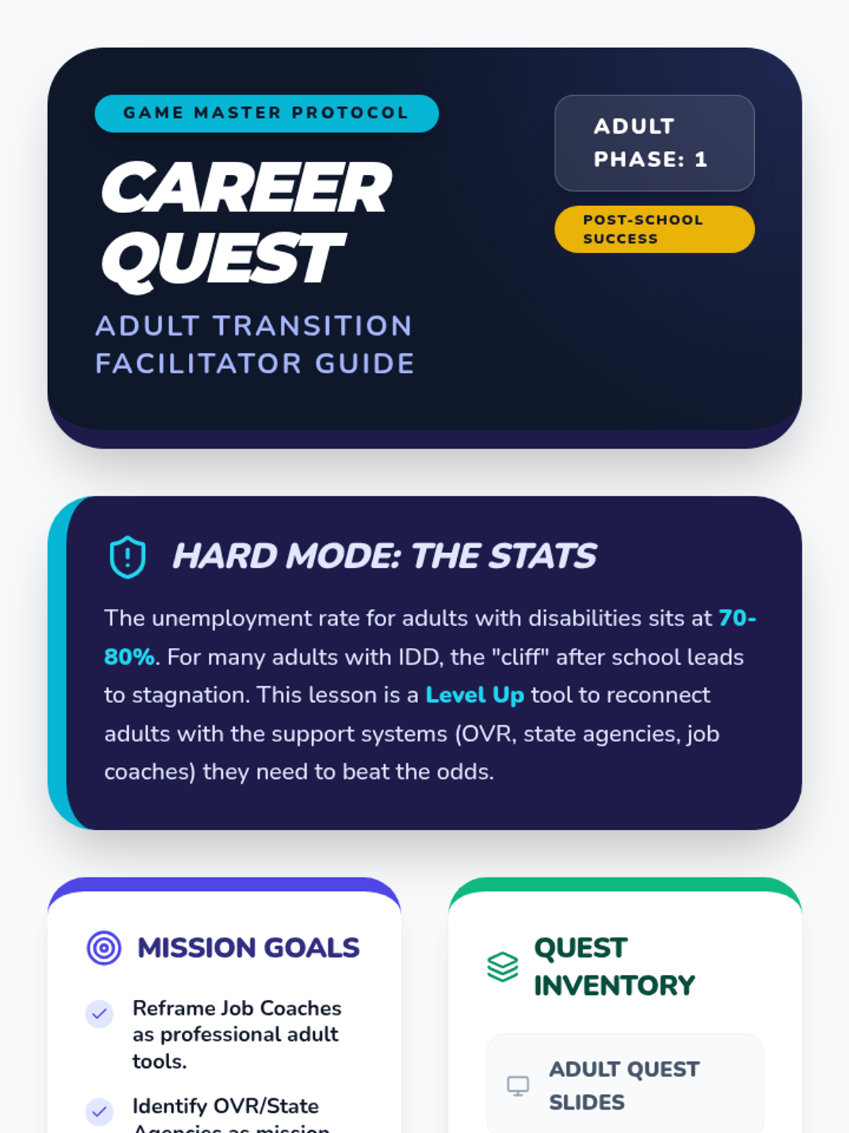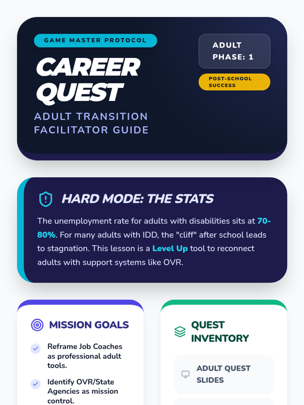 A facilitator guide for adult transition programs serving individuals with IDD. Incorporates research on the 70-80% unemployment rate to provide mission-critical context for educators. Outlines a 90-minute gaming-themed agenda focused on OVR, vocational planning, and adult self-advocacy. Designed to help facilitators transition from 'School Mode' to 'Adult Success Mode'.