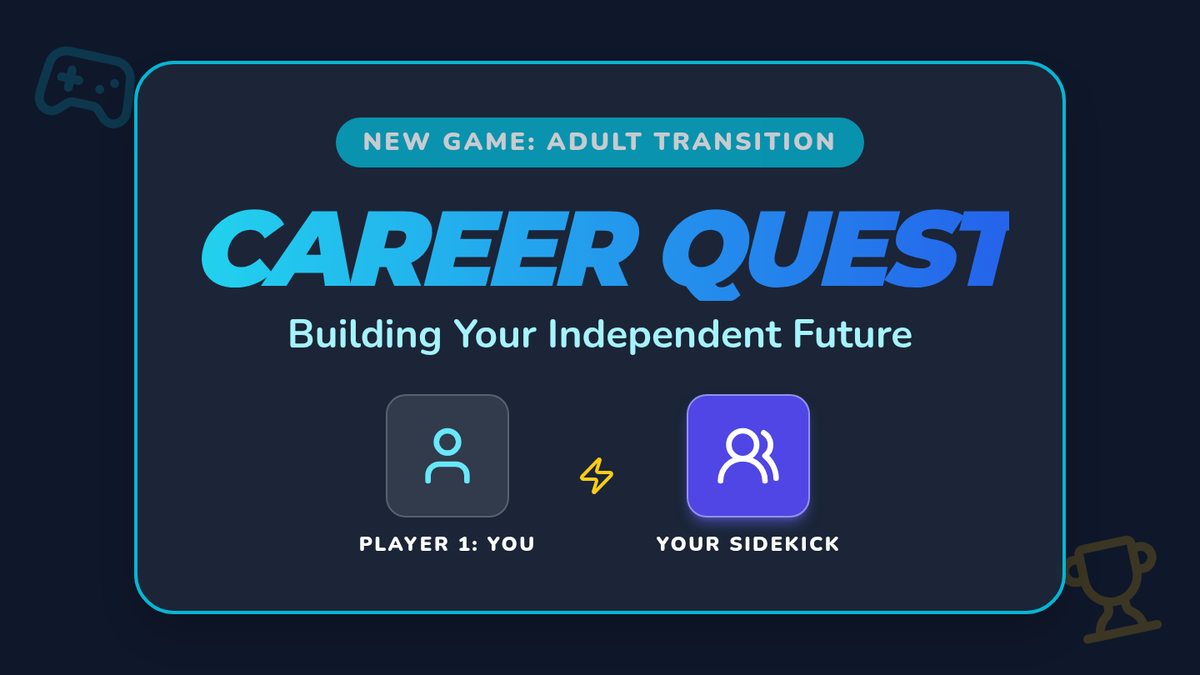 A video-game themed slide deck for adults with IDD in transition programs. Reframes adult services (OVR, vocational programs) and job coaching as 'Sidekicks' and 'Quest Tools' to help the user achieve independence. Uses bold, high-contrast gaming visuals and simple, empowering language appropriate for a post-school audience.