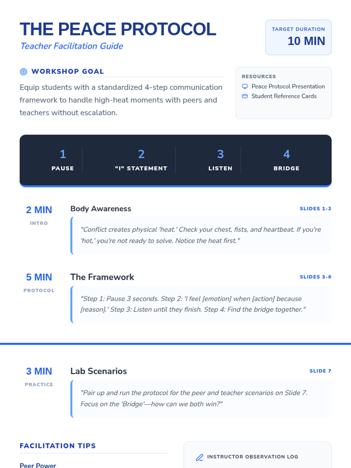 A detailed facilitation guide for the specialized SPED lesson 'The Calm Console'. Includes simplified scripts, sensory-based analogies (Static, Grit), and specific de-escalation guidance. Reframed to focus on school, homework, and demands. Updated with a concrete 'Hard Math' example for the 3-second gap and expanded maintenance talking points. Fixed heading spacing.