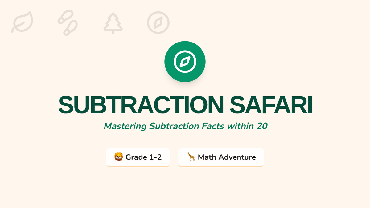 A vibrant, safari-themed slide deck to introduce basic subtraction strategies (counting back and related addition) and warm up the class for practice.