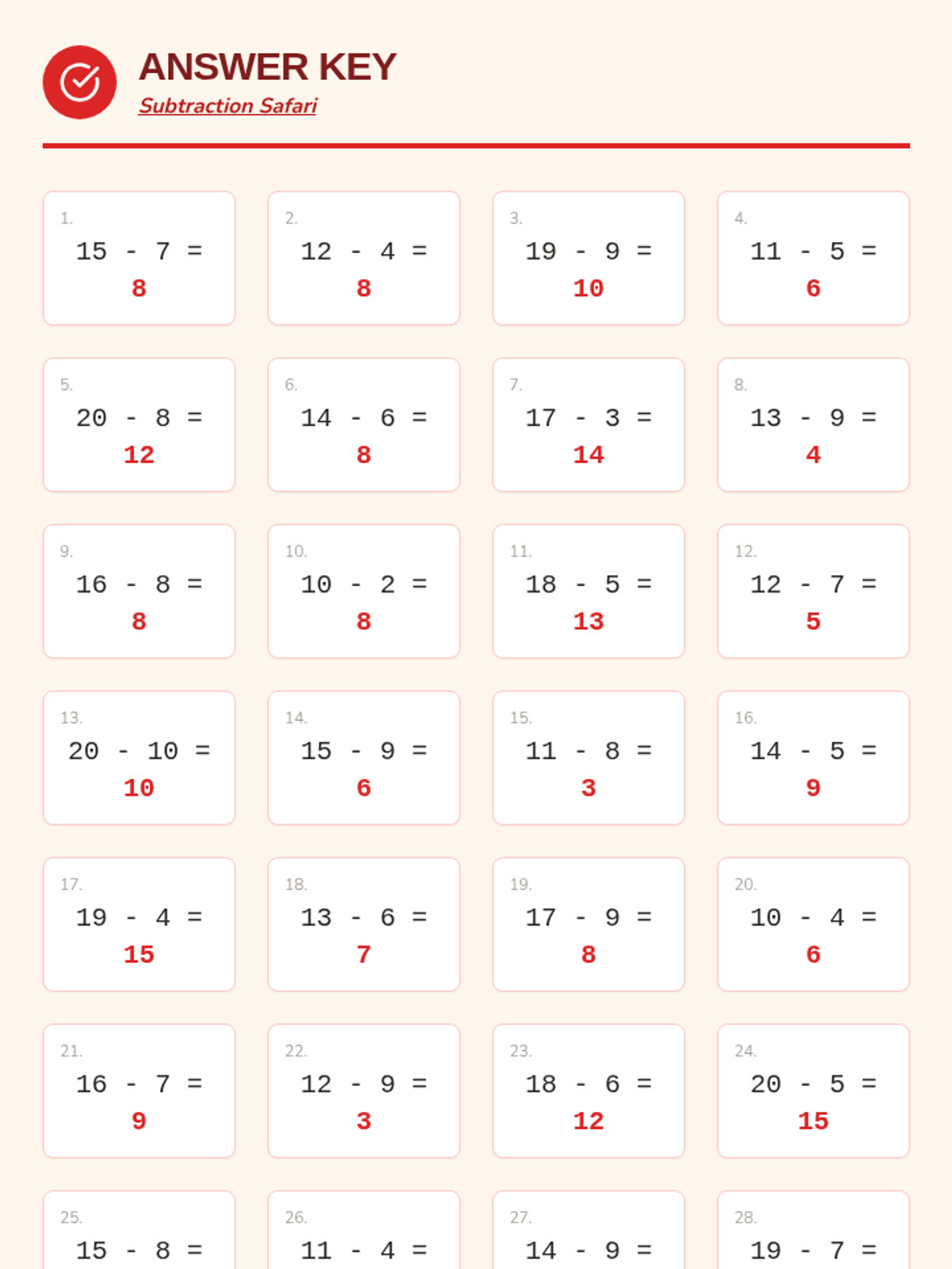 Teacher answer key for the Subtraction Safari worksheet, showing all 40 subtraction facts with answers clearly marked in red.