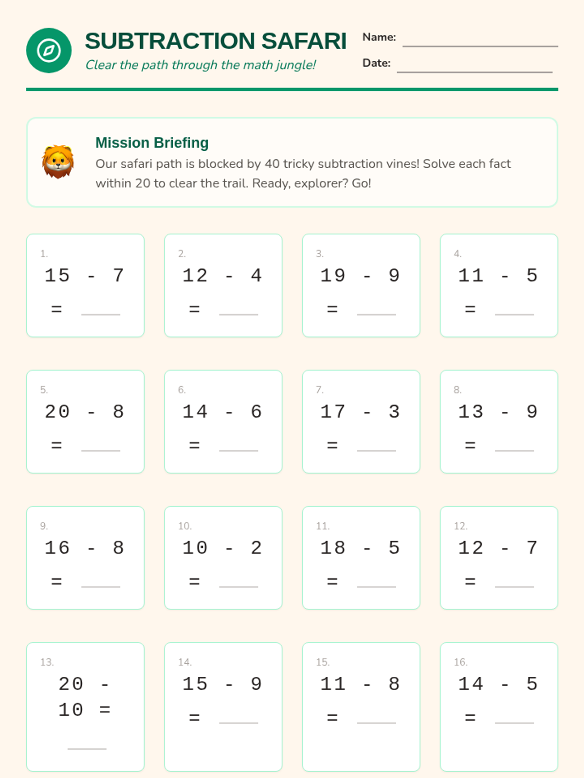 A safari-themed math worksheet featuring 40 subtraction facts within 20, organized in a clean grid with space for student answers.