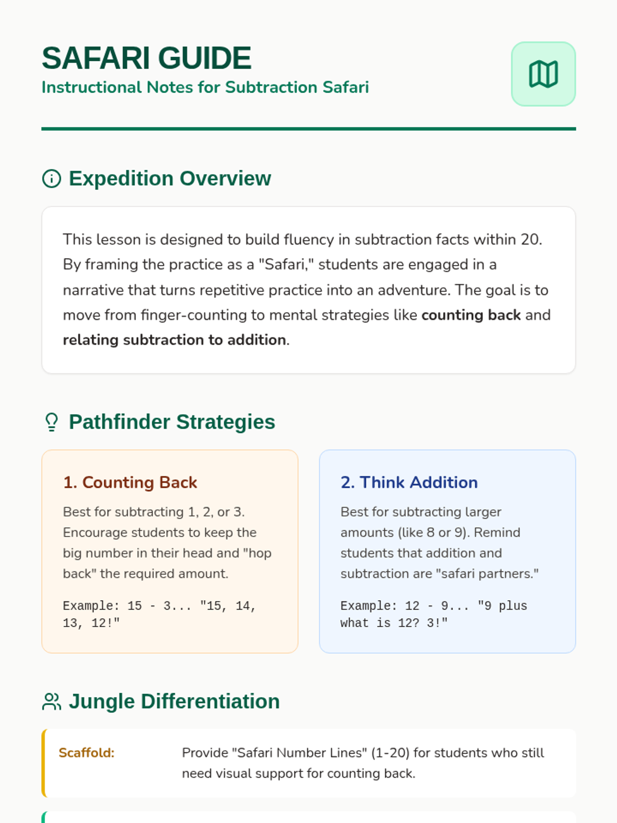 A teacher guide for the Subtraction Safari lesson, including instructional strategies (counting back, think addition), differentiation tips, and delivery suggestions.