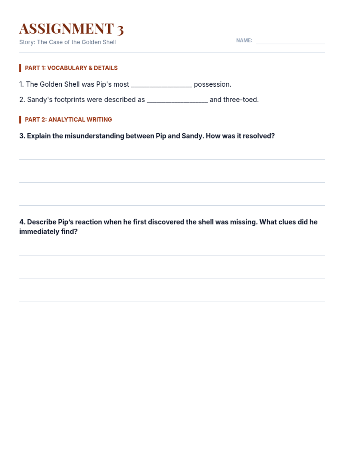 Advanced comprehension worksheet (4th Grade level) for the Golden Shell Mystery, featuring multi-sentence written analysis.