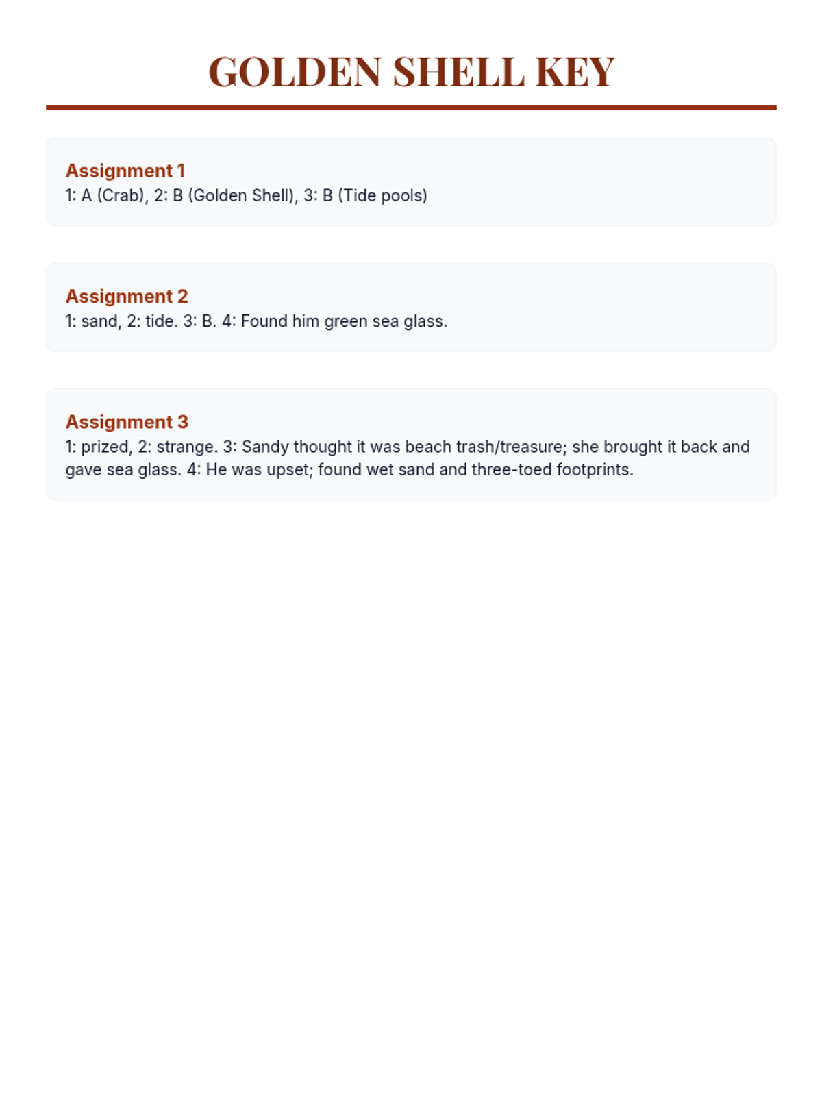 Answer key for the Golden Shell Mystery lesson.