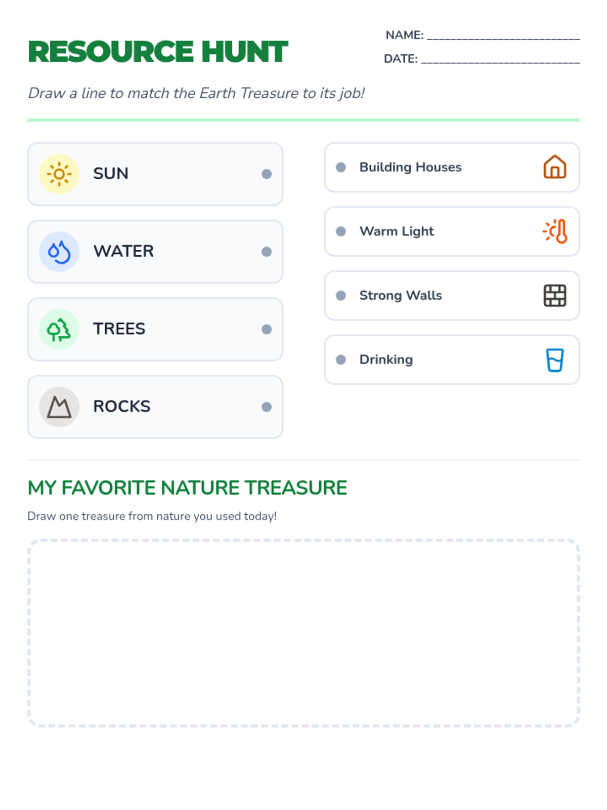 A matching and drawing worksheet for kindergarten students to practice connecting natural resources like the sun, water, and trees to their everyday uses.