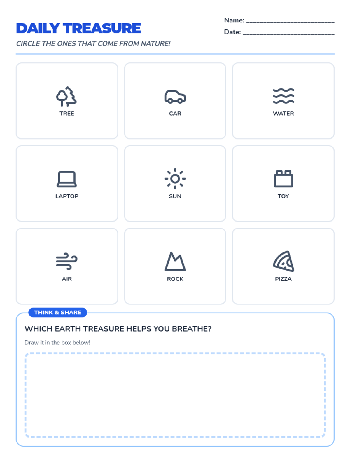 An identification worksheet for kindergarteners to distinguish between natural resources and man-made objects. Includes a 'Think & Share' section about air.