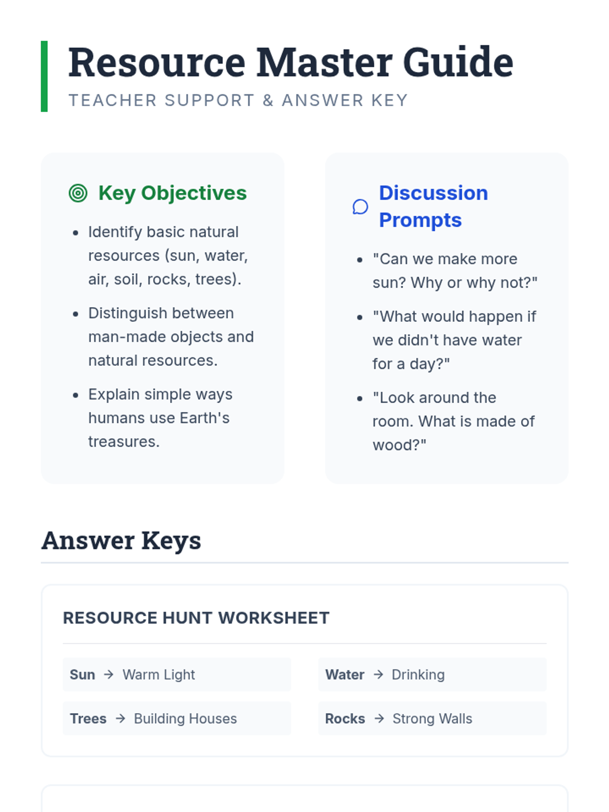 A comprehensive guide for teachers including learning objectives, discussion questions, answer keys for both worksheets, and a suggested pacing guide for the 'Earth Treasures' lesson.