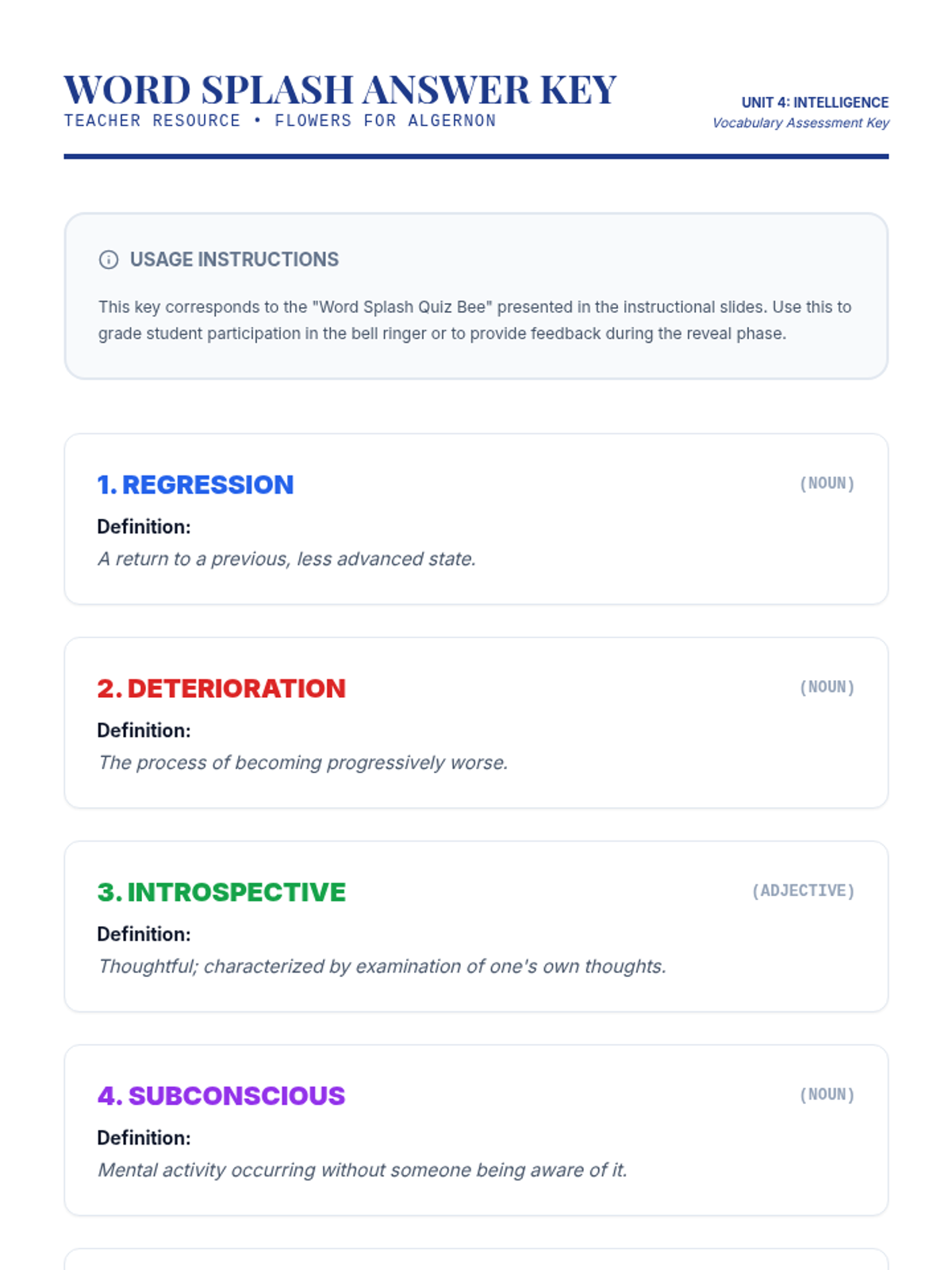 An answer key for the 6-word "Word Splash" vocabulary quiz bee, providing parts of speech and clear definitions for teacher use during the bell ringer activity.