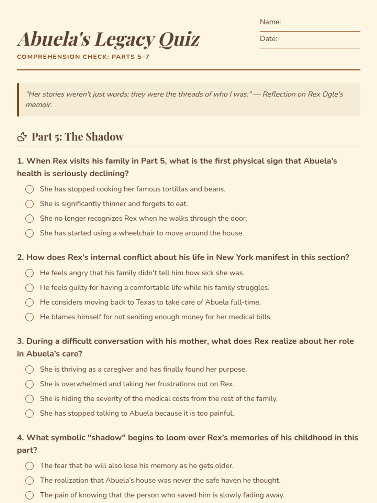 Revised multiple-choice comprehension quiz for 'Abuela, Don't Forget Me' with optimized layout and page-breaking prevention.